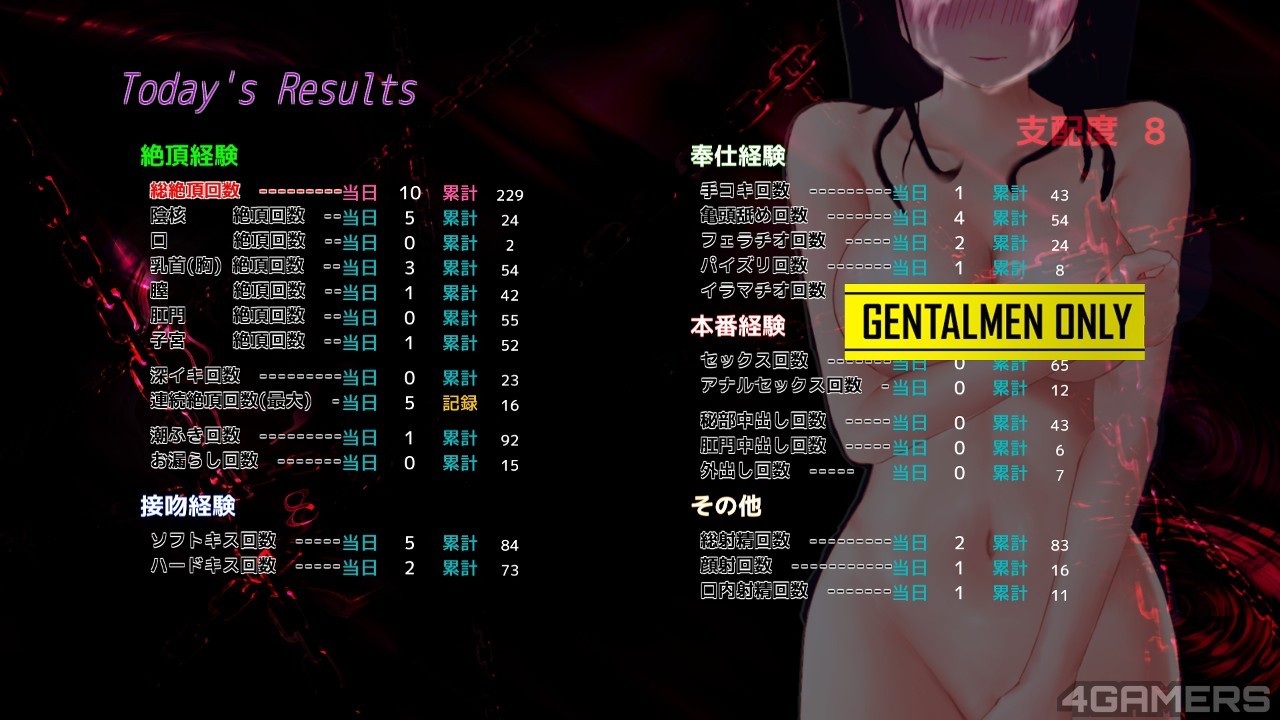 本作的数值设定颇为详细,除了各部位的开发值、整体进度的支配值外,女主角还具有感情值与被虐值、各部位高潮次数记录、总高潮次数等计数。