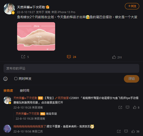 根据中国微博,这条「鱼飞机杯」长度有 29 公分,高度则为 10 公分,表面上一样是硅胶材质,不过製作出来的成品相当 Q 弹,而鱼口自然是唯一的「连结处」。
