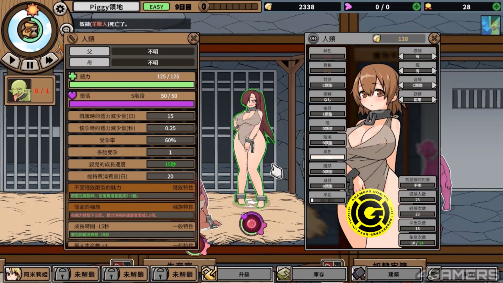 奴隶生出来的魔物也几乎都是等着被卖掉的雄性魔物,雌性后代非常少,放置尸体不管的话不但占空间还会有产生腐败感染其他魔物与奴隶的风险,因此玩家必须时刻注意奴隶体力状态。