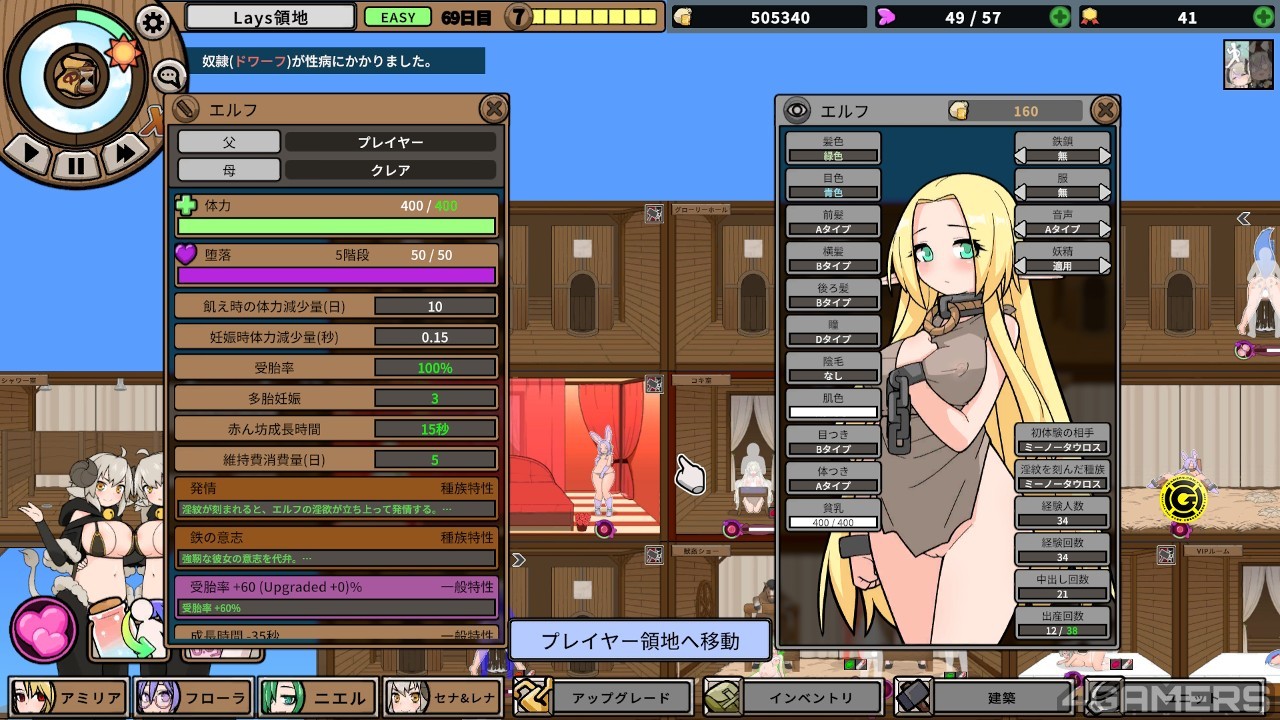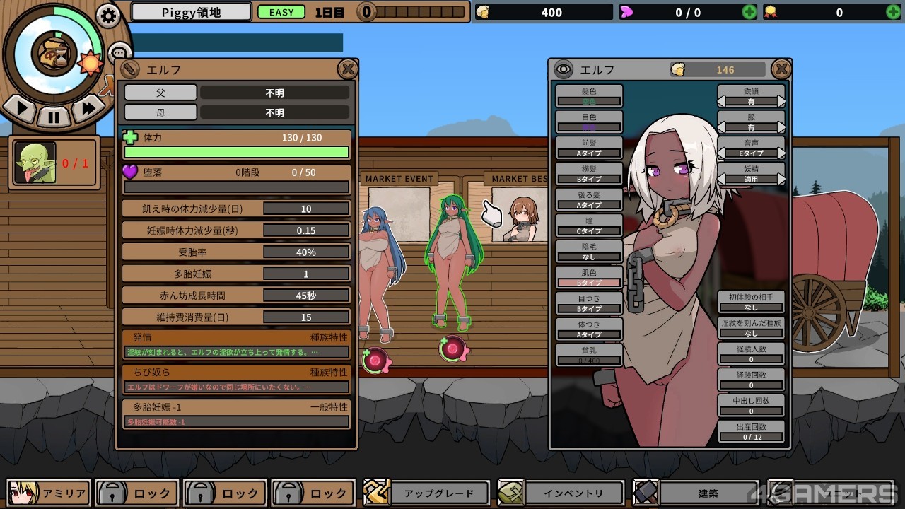 这个玩法的高明之处在于玩家可以延伸出不同后代的换装乐趣(体型、体色、器官、衣着等),纪录父母为谁带来的额外性癖想像,以及因某些意外特质的出现而可以解锁的新 H 玩法(挤奶、卖春等),还可以跟市场的 NPC 结合支线任务,架构会有非常大的发展潜力。