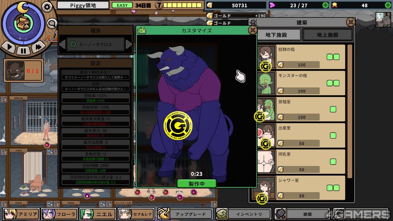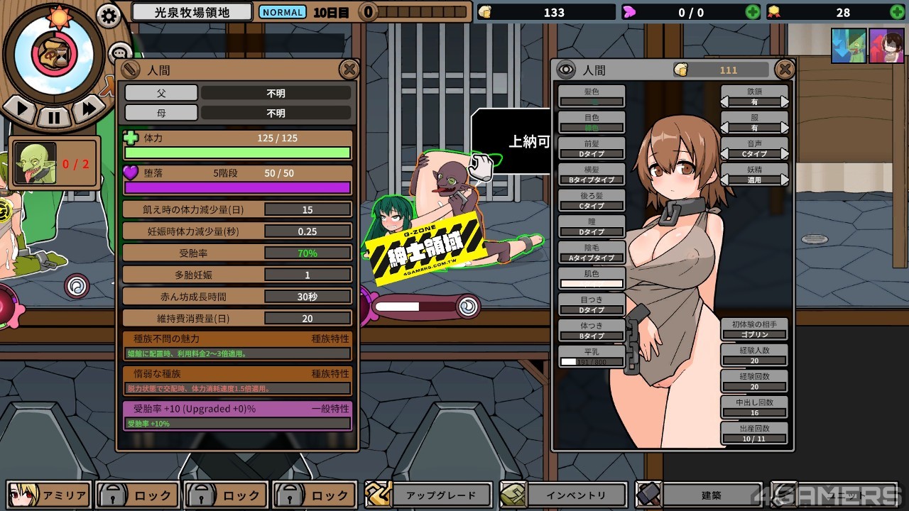 因此本作的游戏目的是最有效率地生出最多魔物,玩家要做的是把配种→生产→榨乳的流水线建立起来,在奴隶生到不能生之前榨乾她们最后一滴「产能」。这本身就有一种变态的乐趣。