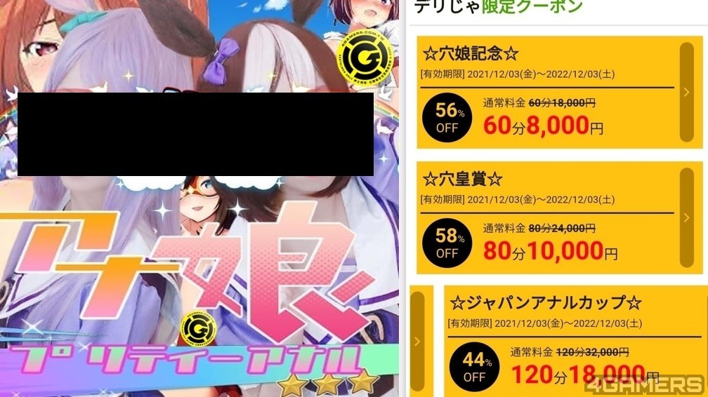 然而,根据日本绅士在 Deli-Fuzoku 仲介网站上发现到,某一家店铺似乎将《赛马娘 Pretty Derby》的捏他当成了宣传,名叫「アナ娘~プリティーアナル」,直截了当的以「穴娘」自称。