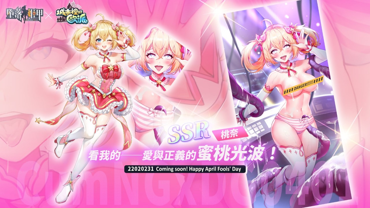 《堕落姬甲》也宣布于 2202 年 2 月 31 日将与成人手游《绅士冒险》以及《城市里的欧派》展开特别合作,届时高人气角色「T3-5」与「桃奈」将会以全新面貌出现在《堕落姬甲》游戏中!