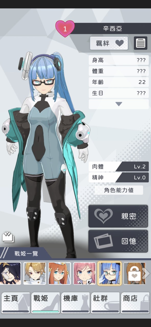 接着来到「战姬」介面,这里可以浏览战姬们的个人资料,如果满足条件,就可以进一步深入开启「亲密」或「回忆」两种 H 事件。
