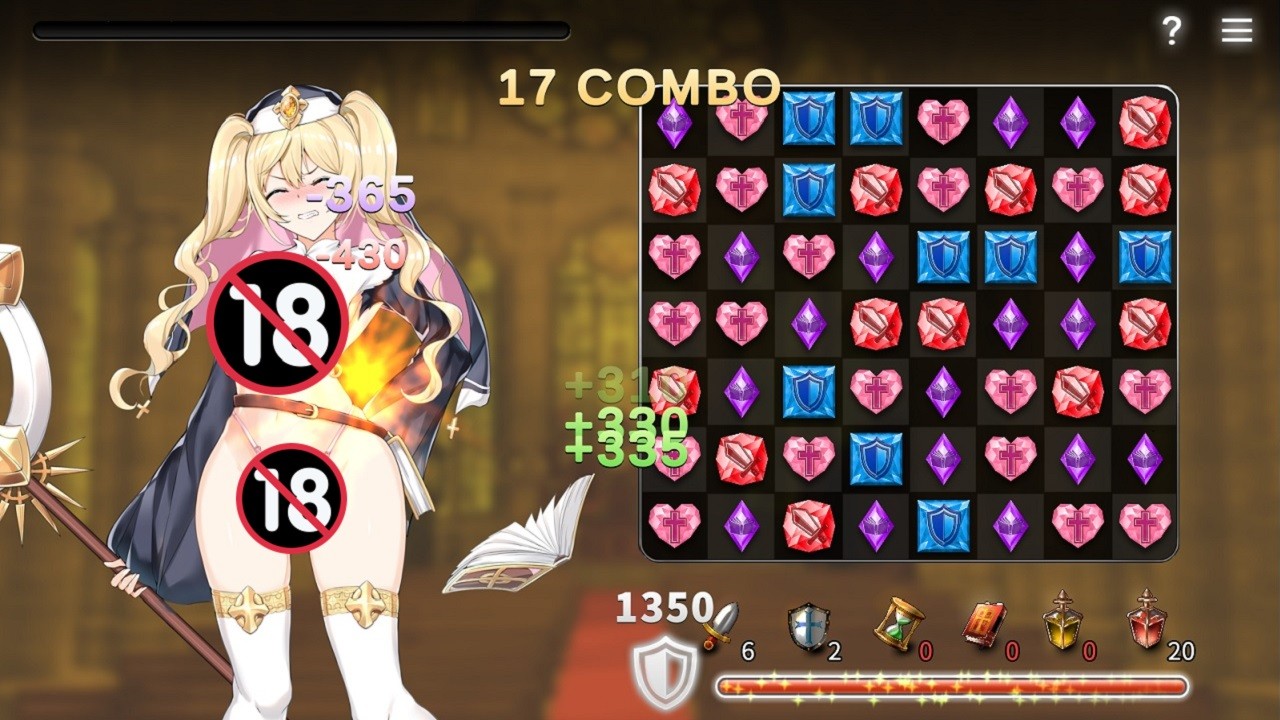 本作在战斗中实装爆衣系统,玩家可运用消除宝石来破坏她们身上的性感服饰,除此之外,在游戏大厅或是观看剧情时,也能透过隐藏 UI 功能来去除文字介面,让玩家可以好好欣赏魔女最美的那一面。