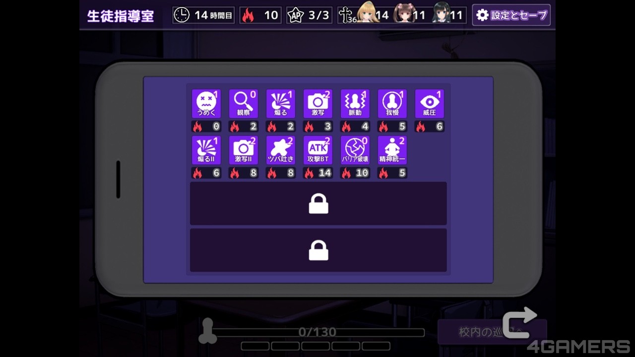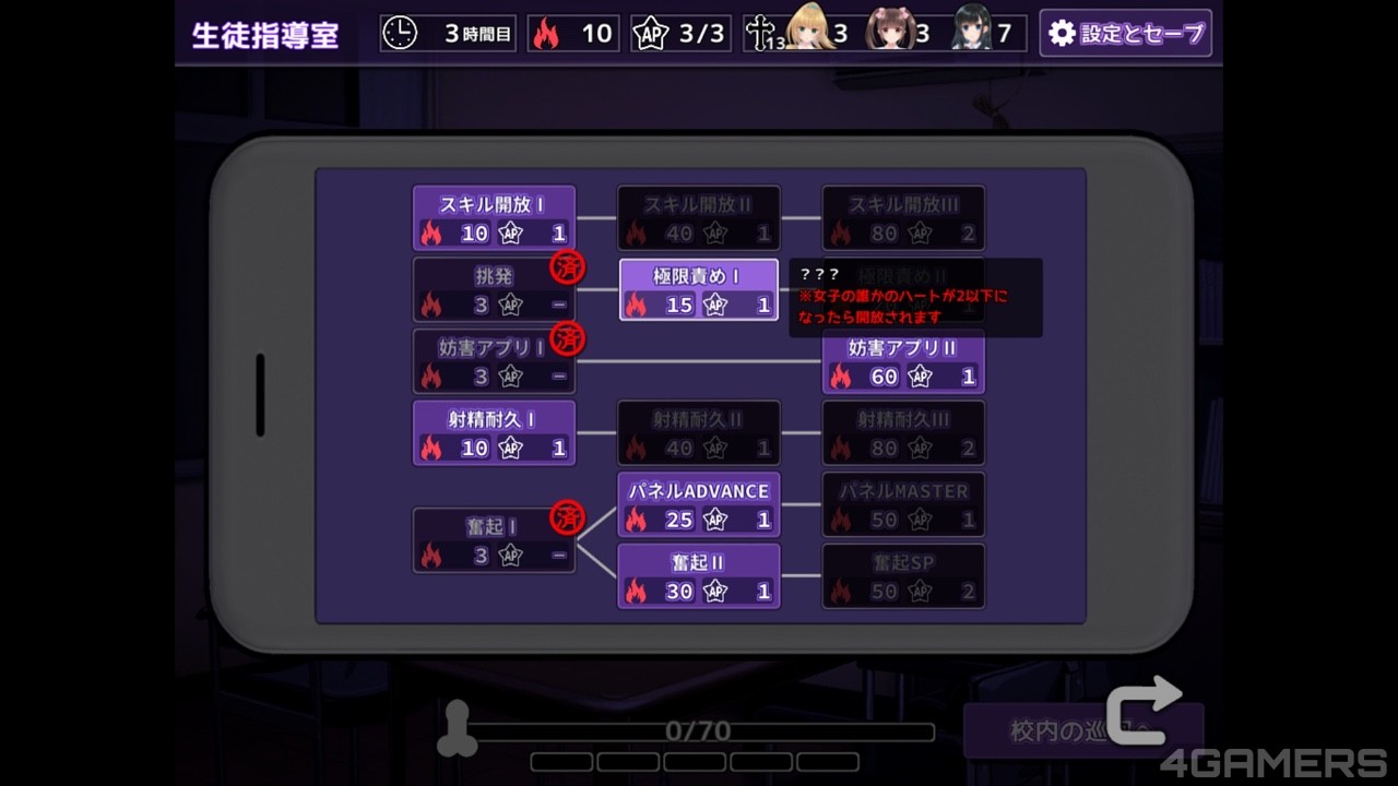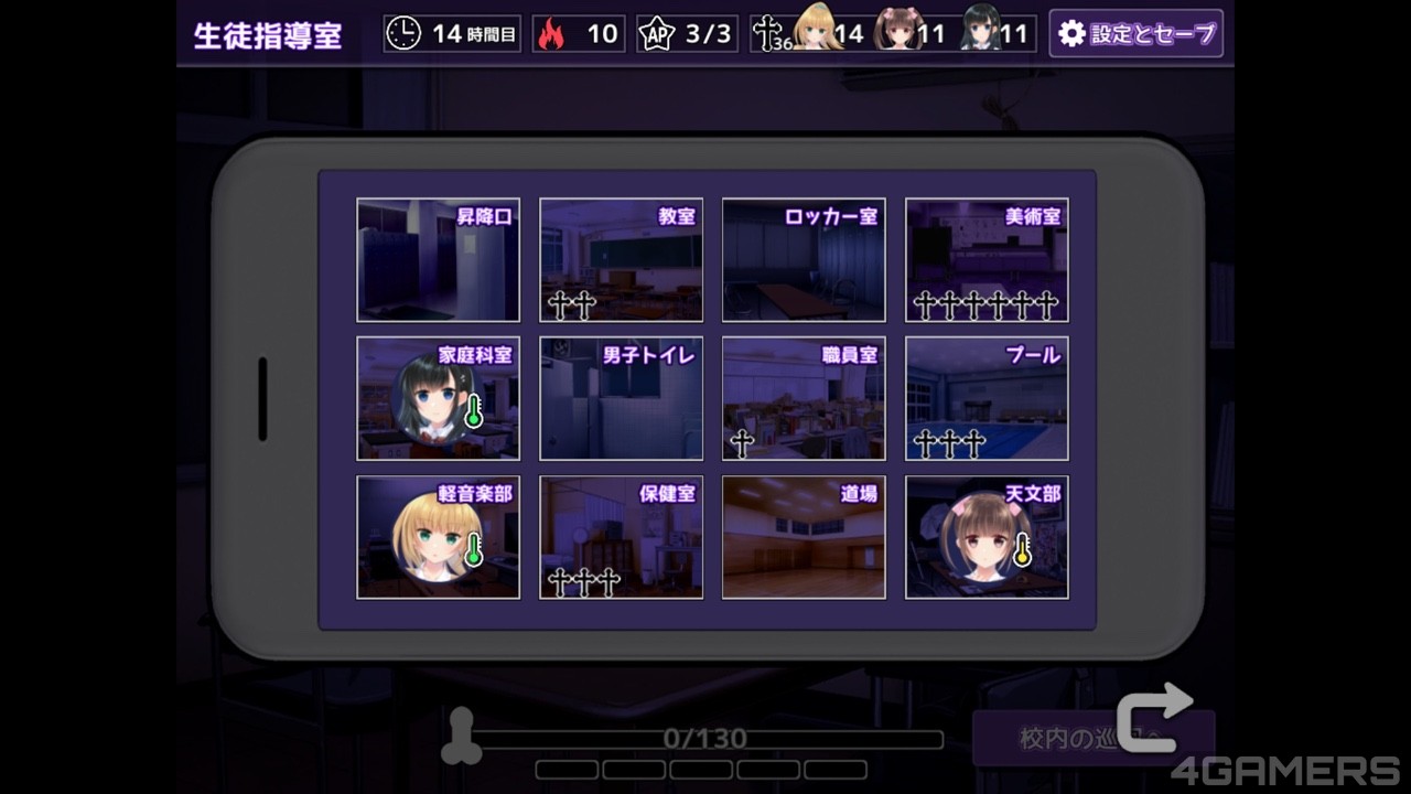战斗之外玩家也需要思考每小时回合行动力的花费,是保留行动力快速增加自己的技能点数解锁更强力的技能,或对女角们搜索十字架的行动进行妨害,抑或是性骚扰女角来直接减少她们已收集到的十字架、或是增加下次战斗的胜算等,需要玩家动脑思考的细节很多,游玩起来乐趣十足。