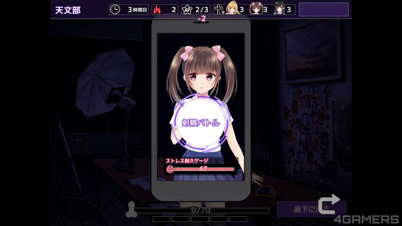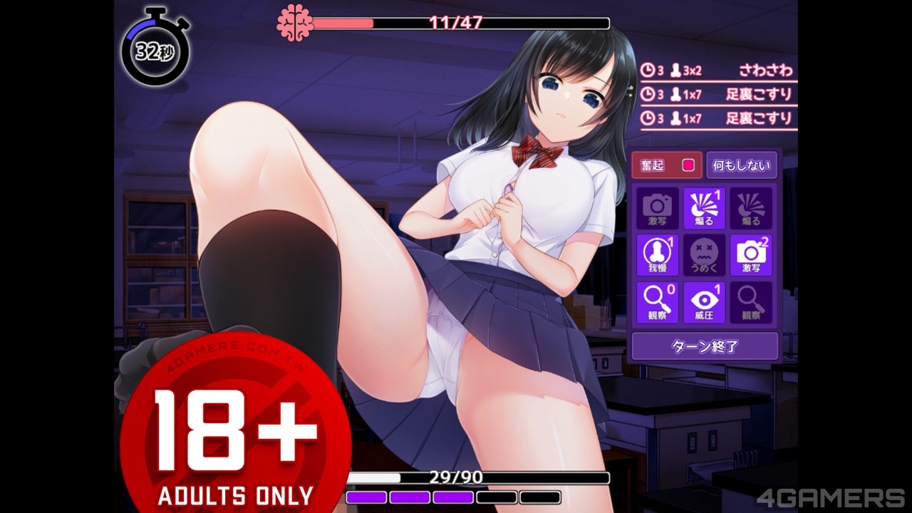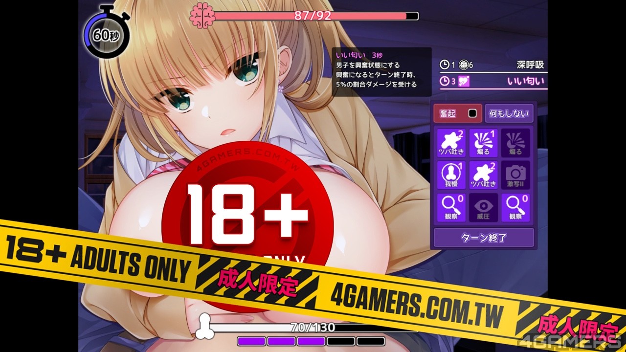且接下来每次对女角造成伤害都可以额外再多扣 5 秒。只要玩家在战斗时间 3 分钟内忍住不射就可以取得本场战斗的胜利。