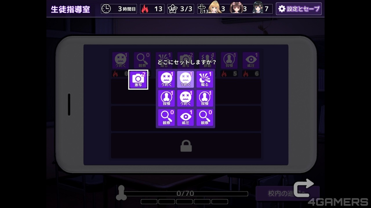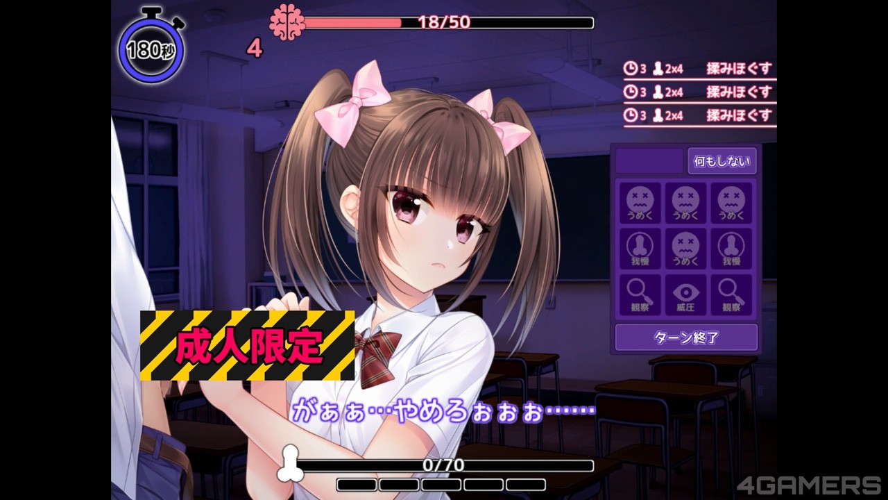 玩家可以选择放进牌组里的招数相当多样,包括了「吐口水」、「下流发言」、「嗅闻」等让女角各种噁心不适的伤害系卡片,当然也有「破坏防壁」、「忍耐」等辅助及防御系卡片在内。