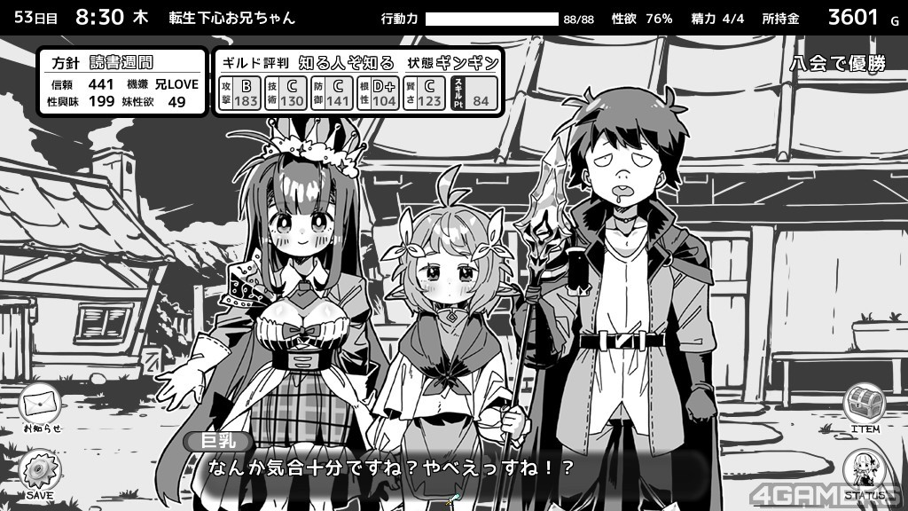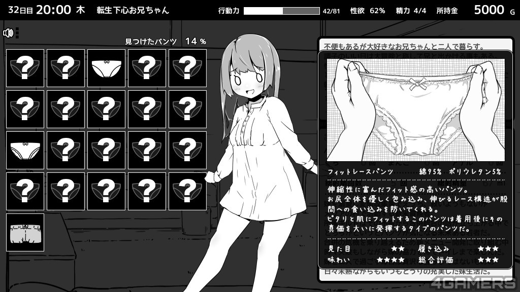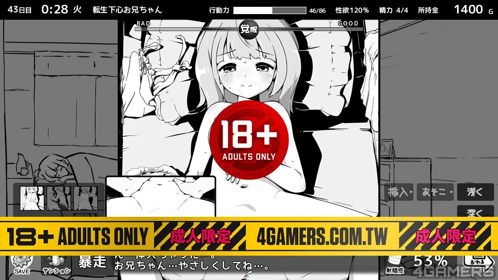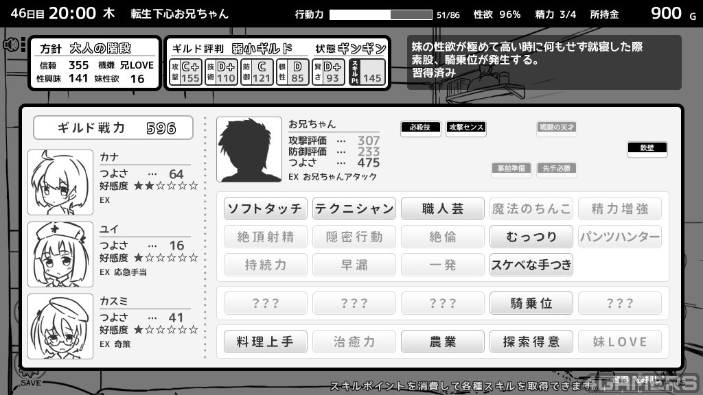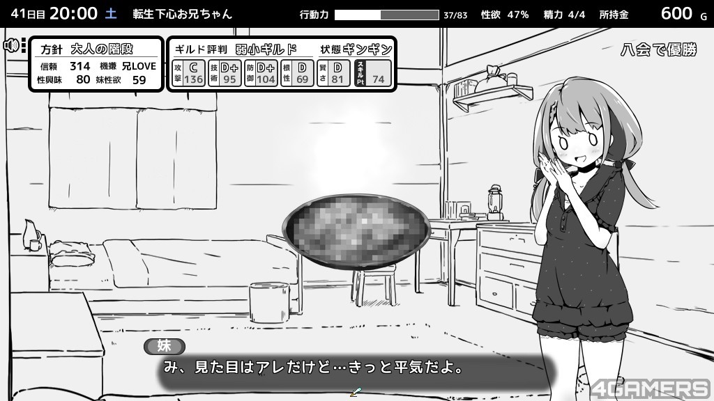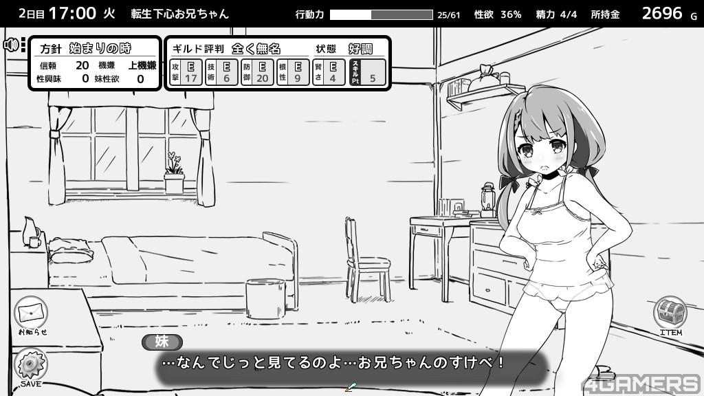 不过这次玩家部分多了新的「性欲」数值,会随着事件与时间增长,如果没有「适当」的排解,会爆炸而导致全能力下降。前代有的偷窥部分与晚上睡眠情节也都还是存在的,总之一句话,要扮演怎幺样的哥哥还是在各位玩家的一念之间。