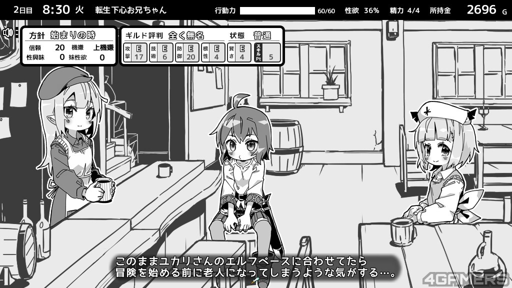 主角一天的流程是早上到公会去看看有没有任务能接(公会长由香里会给你三选一),选择后会得到相对的收益,再回家与妹妹共进晚餐。