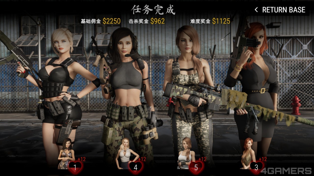 游戏流程基本上就是要玩家进行 FPS 关卡赚取金钱与难度星星,以解锁新的女角,并在基地中购买装备以及礼物等。与一般恋爱模拟游戏一样,玩家也需要购买礼物给女角来增加亲密度,以观看色色的事件,整体架构完整,并不难懂。