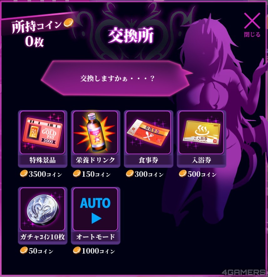 或是购买「自动拉霸」「加速三倍」以缩短点滑鼠与等待的时间。(说实在话有了这几个选项比较轻鬆)不过所有看过的场景与跟淫魔「交流」的机会也都是要靠代币买,想想这间店要钱也要命,还蛮黑的。