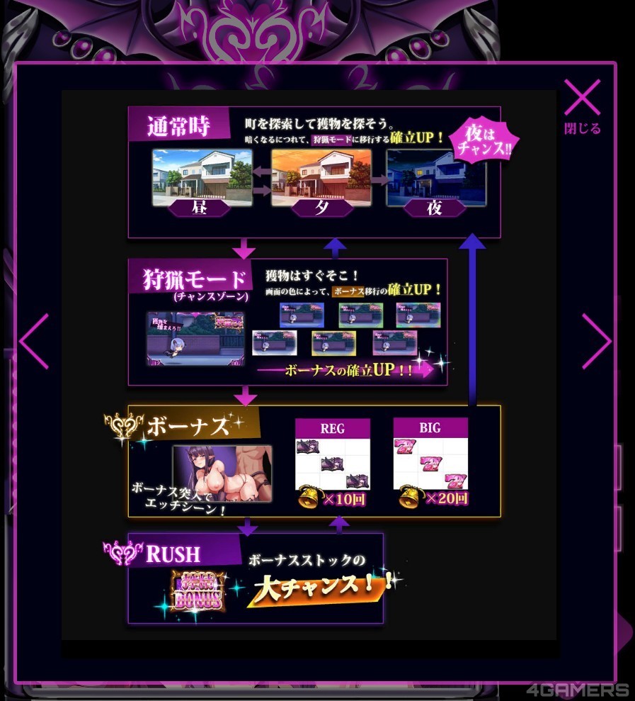 玩家除了转到中奖符号可以得到回馈之外,依照机台有一定机率会进入「狩猎模式」:也就是有机会转到中大奖的模式(俗称确变),机台也会变更演出,变成晚上淫魔在路上袭击路人的样子,如果袭击成功,就可以得到 150 枚到 600 枚不等的代币,还可以观看路人被袭击的动画(?)