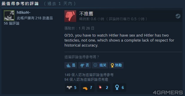 Steam 玩家 h8koN-留下一则搞笑负评:「0/10,你看到的是拥有两颗蛋蛋的希特勒在做爱,而不是一颗,这完全缺乏对历史正确性的尊重。」