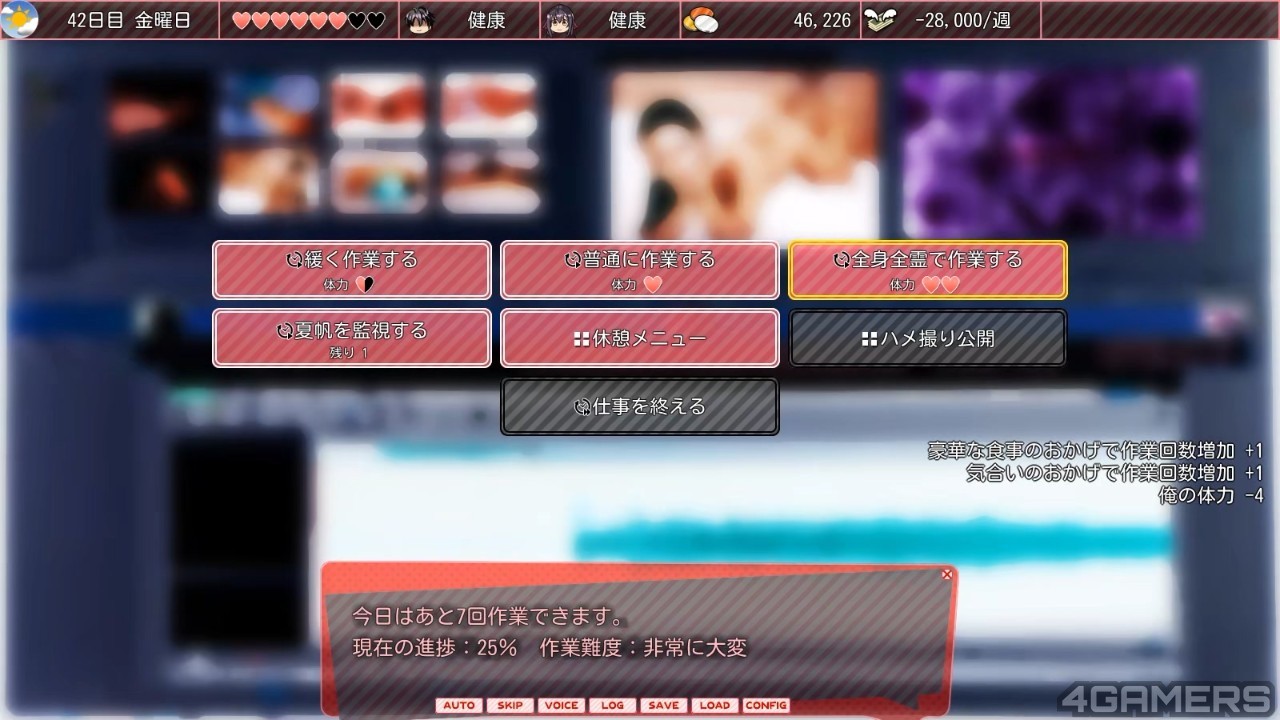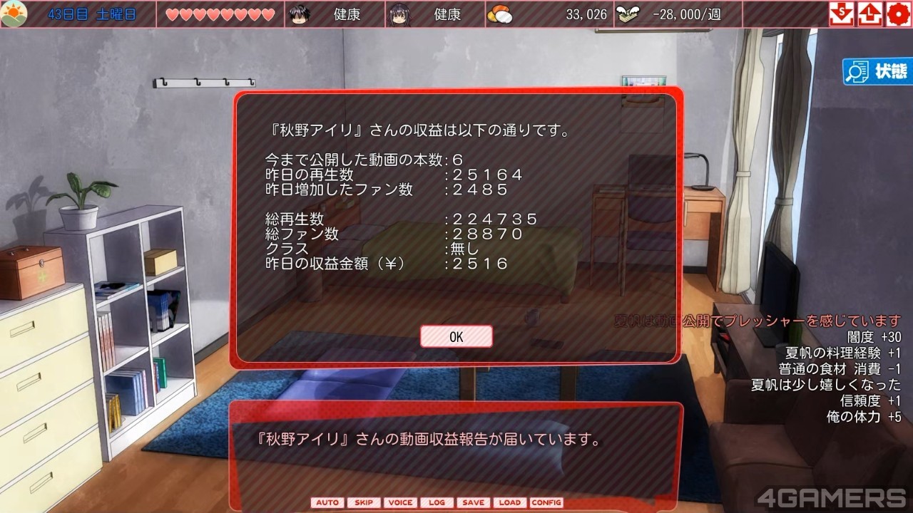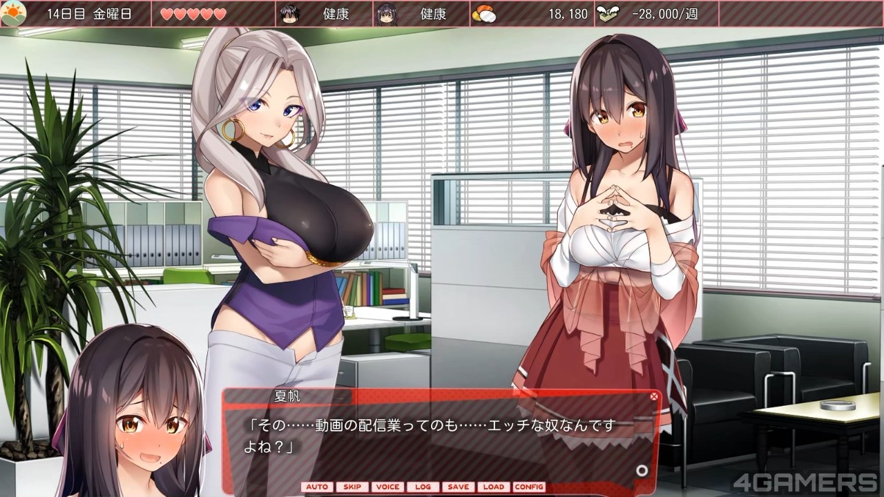 可是就算你持之以恆地拍,也只是解决了金钱的问题。随着你拍摄的 AV 越多,夏帆的「闇度」也会逐渐增加,这是一个会增加精神压力和生病机率的数值。为了消除闇度,你还需要在假日花钱进行约会来消除压力。