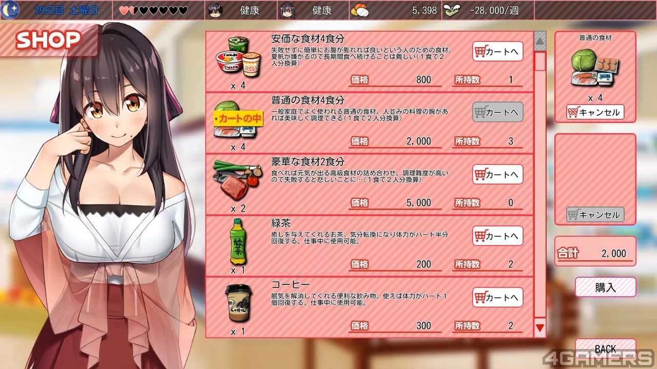 游戏中要花钱的东西不只是食材,举凡补体力用的饮料、成人玩具的购入也通通都要钱,再加上一週还要付出 24,000 元以上的闲杂生活费,一週实收只有 50,000 元左右的男主角根本可说是週光族,完全养不起如花似玉的正妹。