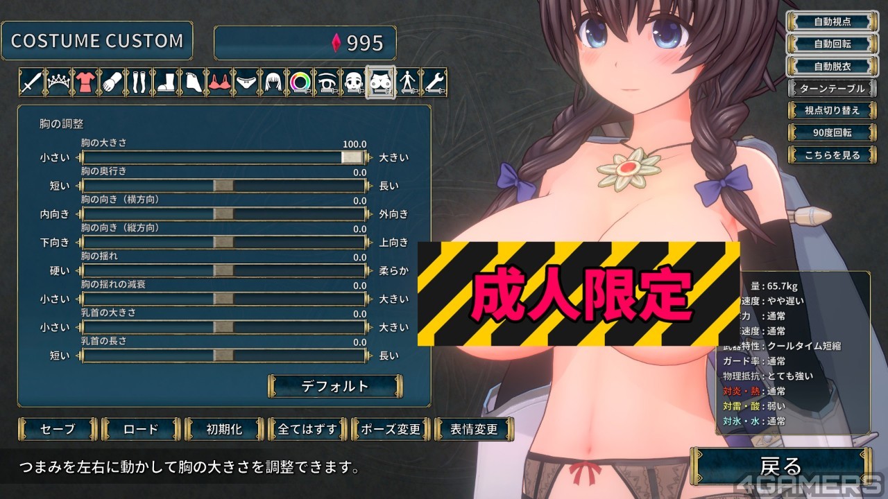 玩家还可以调整莉嘉的身高外貌,从髮型、头髮颜色到身高体型都能改动,最有趣的是把莉嘉调整成巨乳的话虽然灵活度会下降,但是物理防御力会大幅上升,实在是没有不把村姑改造成巨乳的理由。