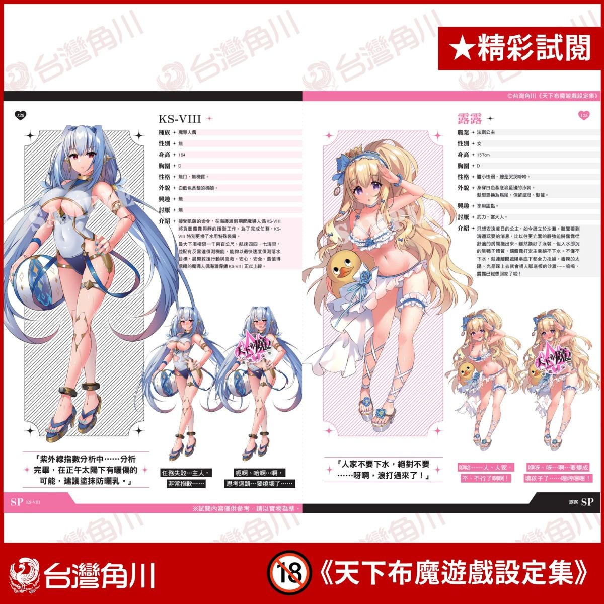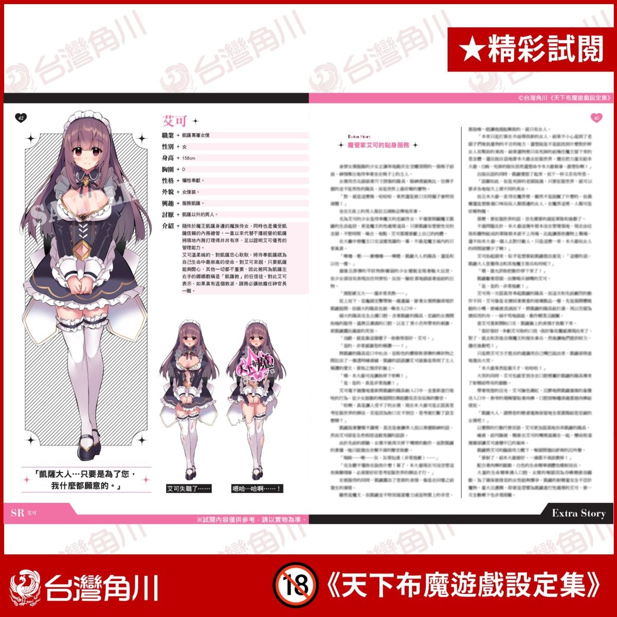 《天下布魔游戏设定集》收录 55 名魅力角色立绘与设定资料,以及 35 名人气角色调教场景与福利画面。另外,设定集还有收录 4 篇番外篇小说和游戏製作人刃雾翔的长篇访谈。