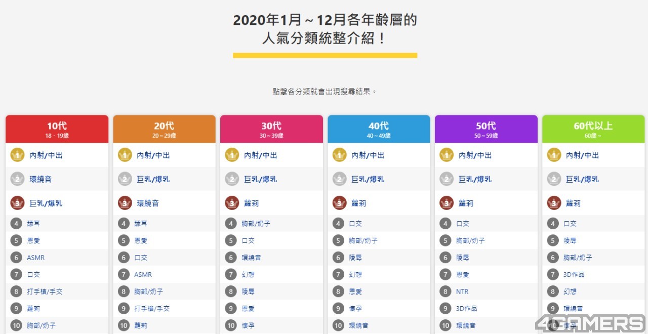 这次的人气分类排行榜是按照年龄层分类,从 10 代(18~19 岁)起至 60 代以上,汇集 6 个不同年龄族群,排列出绅士们对哪些作品的喜好。显而易见,第一名青一色都是「中出」。