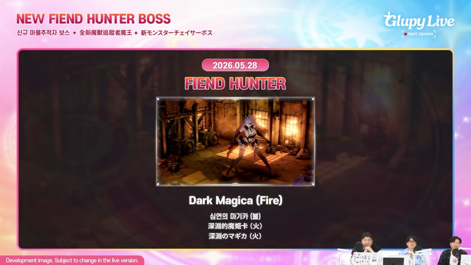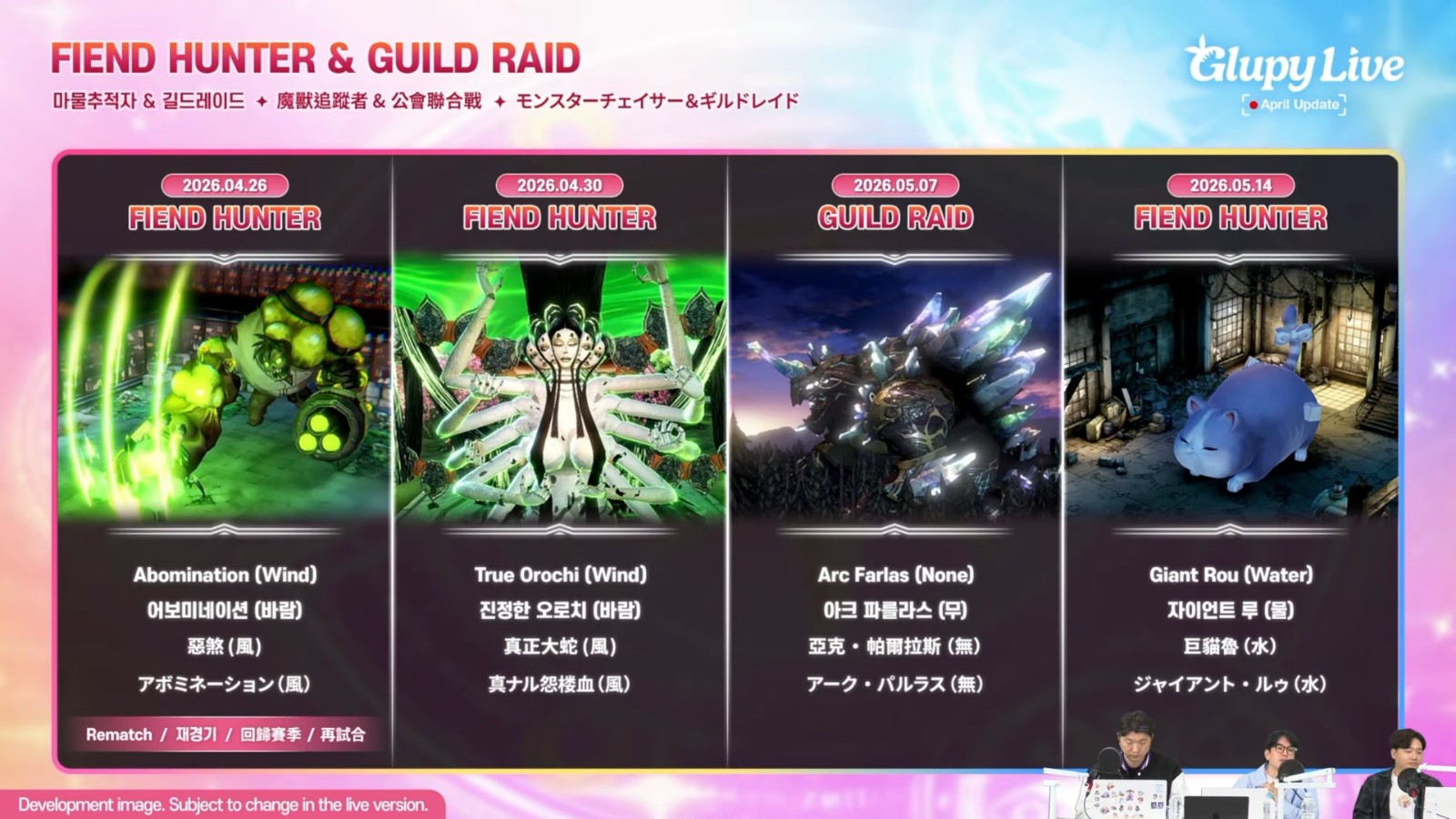 其中魔兽「恶煞」将会从4 月23 日作为回归赛季展开,没有练习赛,将直接进入狩猎期间。让玩家可以直接使用先前狩猎恶煞时的战略,玩家无法使用在该时间点后推出的角色或服装。虽然目前游戏可以载入之前狩猎期间使用的阵型,但这个回归赛季无法使用这个功能。