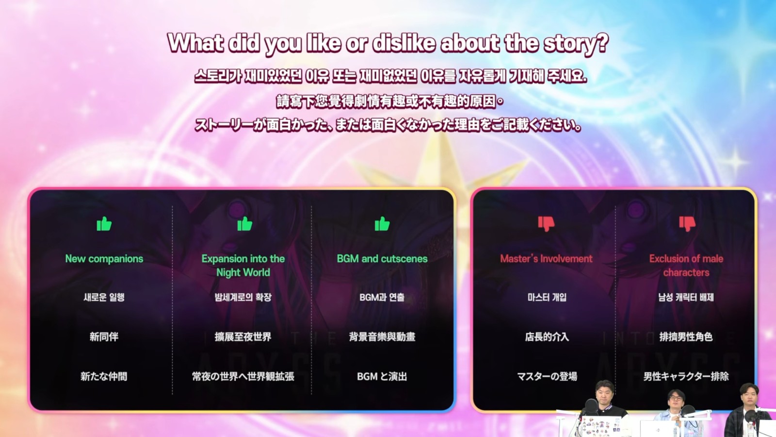 针对游戏卡带20「坠入深渊」的问券调查结果,玩家给予好评的方面是增加新同伴、扩展至夜世界、背景音乐与动画;相对的,店长介入以及排挤男性角色也成为主要负评原因。