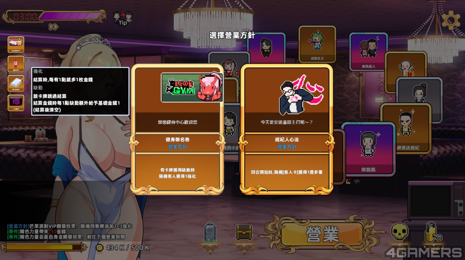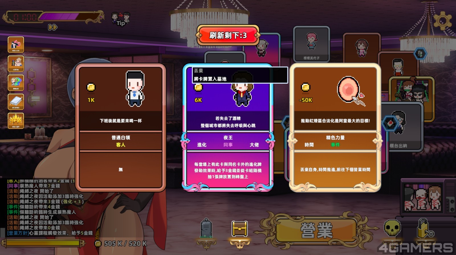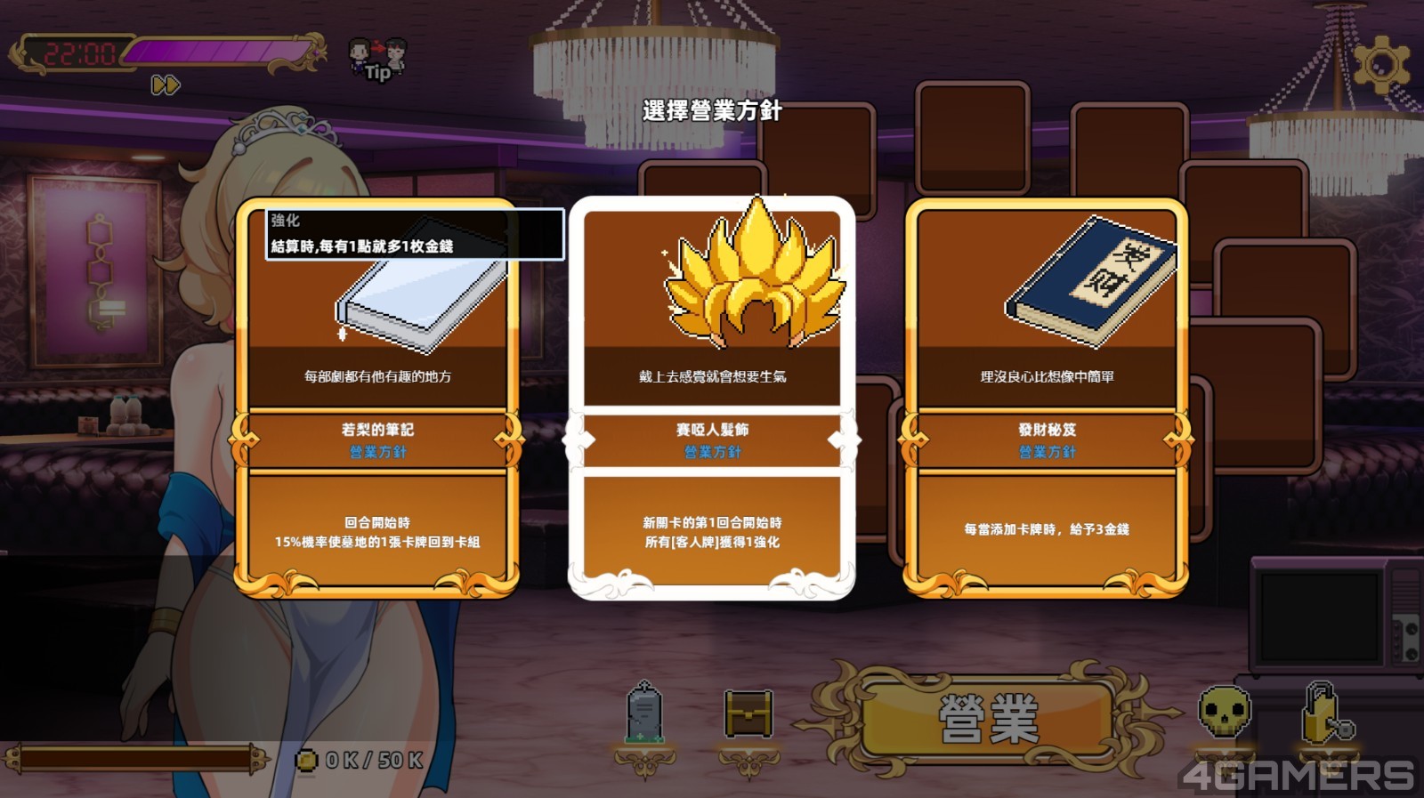 而游戏的进行模式是一个轮盘机制,玩家在每个夜晚营业,每个钟点都有 10 回合的转轮盘次数,透过「客人卡」、「同事卡」、「活动卡」与「道具卡」不同的加成,每转一圈来获得相应的金钱作为营业额。