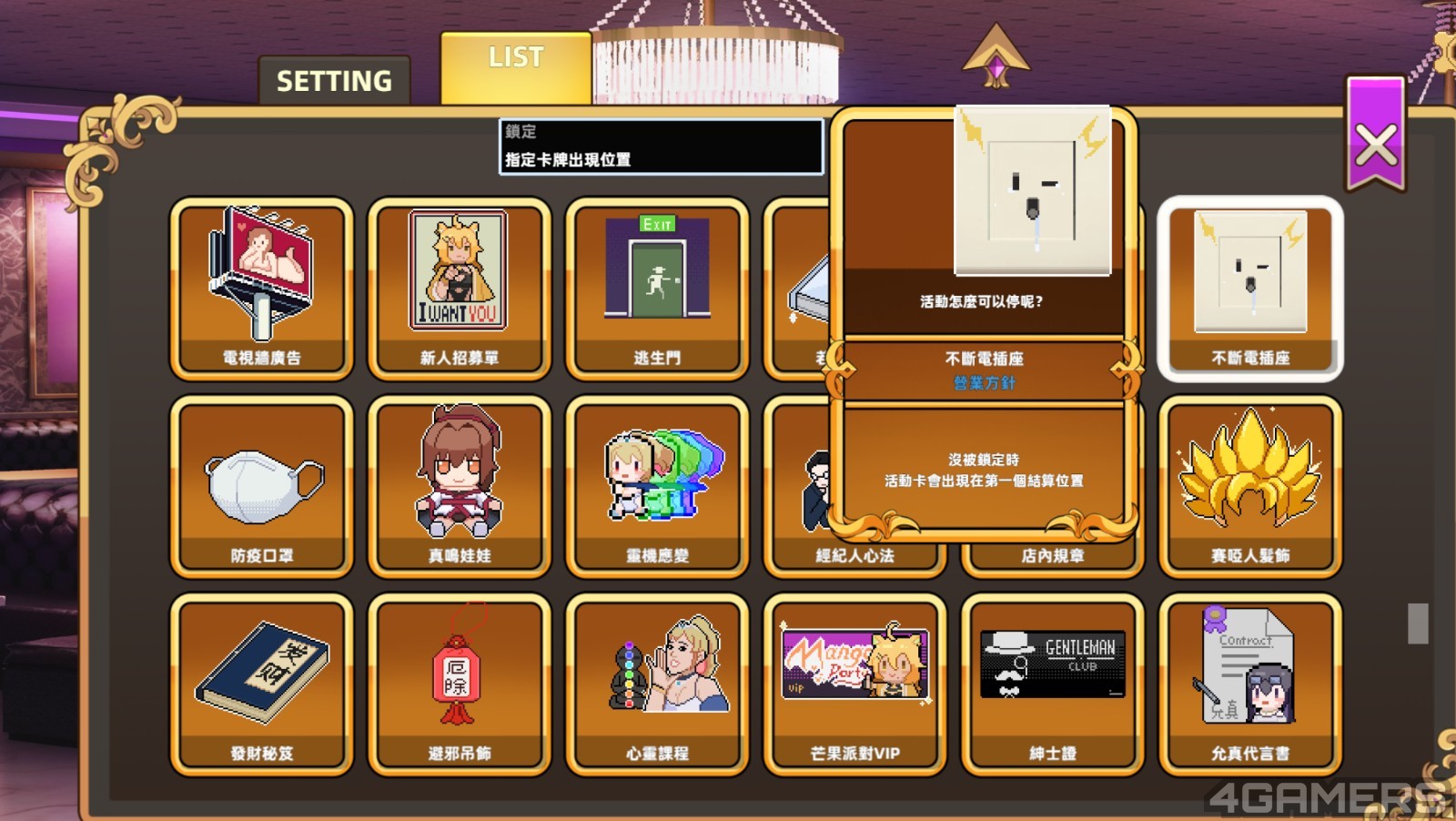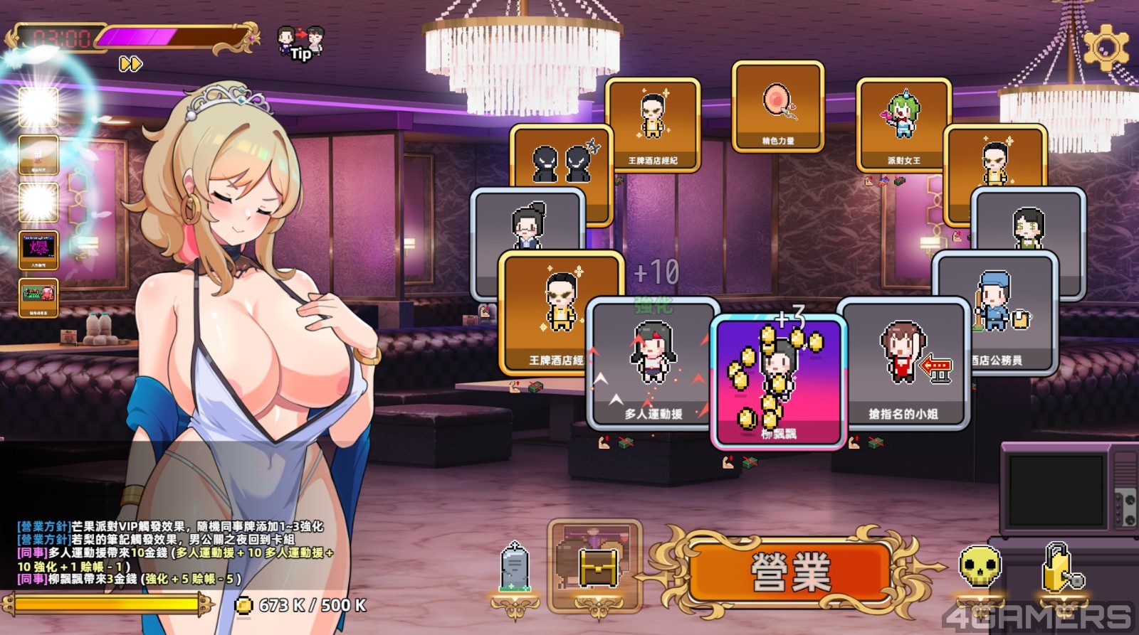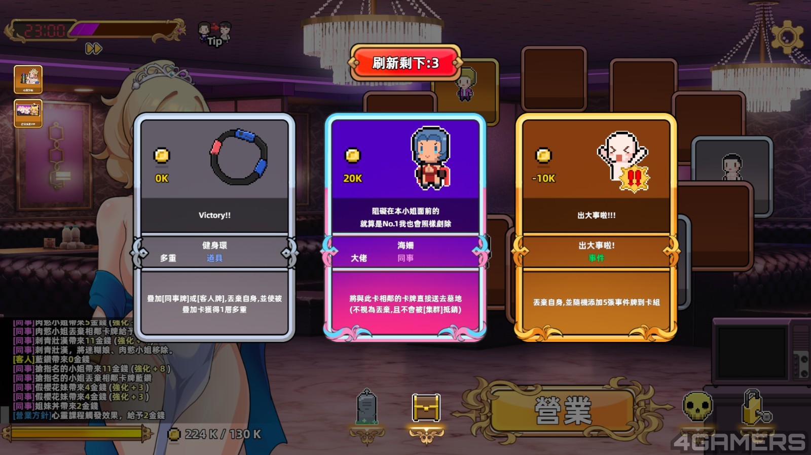 而游戏的进行模式是一个轮盘机制,玩家在每个夜晚营业,每个钟点都有 10 回合的转轮盘次数,透过「客人卡」、「同事卡」、「活动卡」与「道具卡」不同的加成,每转一圈来获得相应的金钱作为营业额。