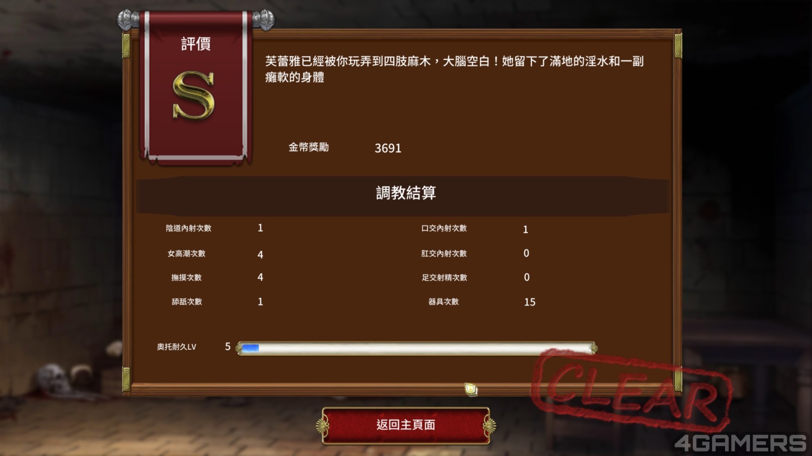在游戏过程,只要顺利达成任务目标即可循序渐进解锁体位与器具,金钱的收入也足够购买道具维持女王健康,也能购买增强体力等辅助道具,让调教过程更加顺利。