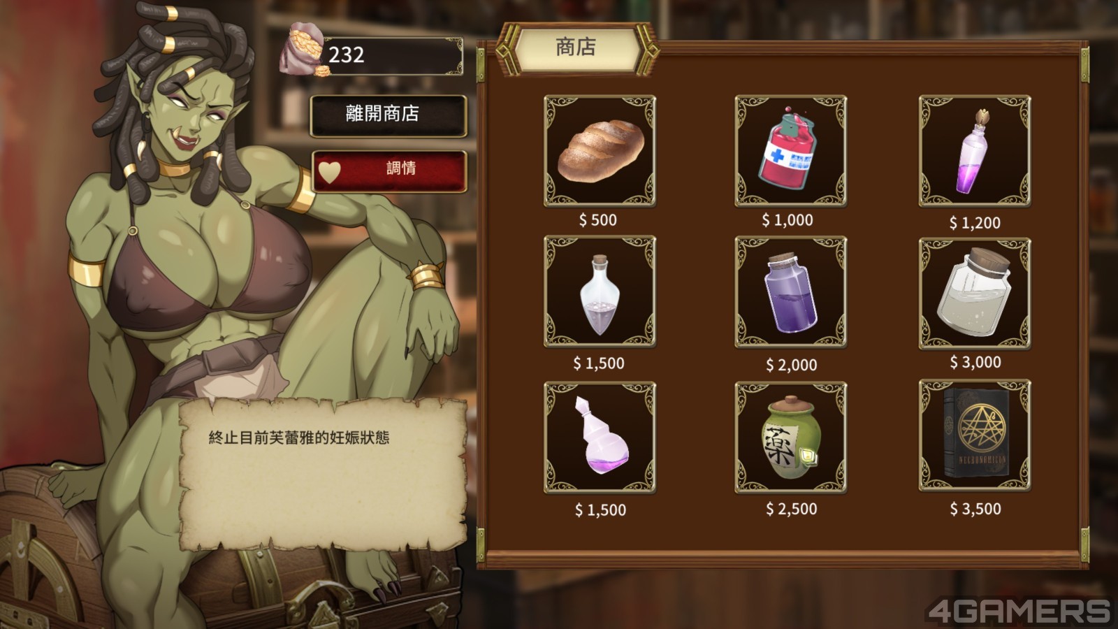 值得一提的是,在调教过程需要注意女王的健康值,若过度调教则会触发 BE 死亡事件,玩家可透过商店购买药水恢复女王的健康;