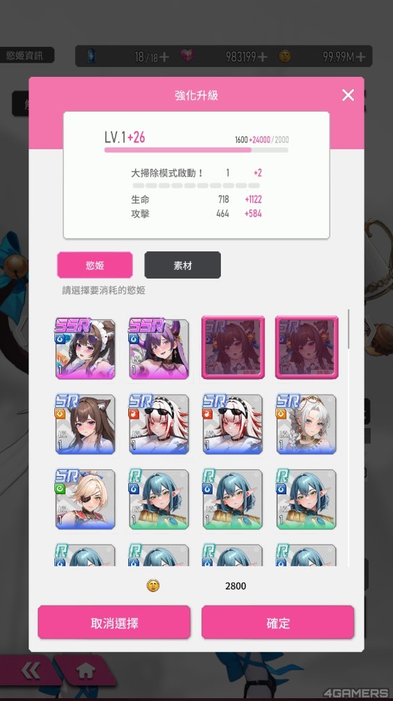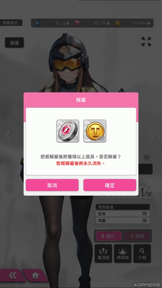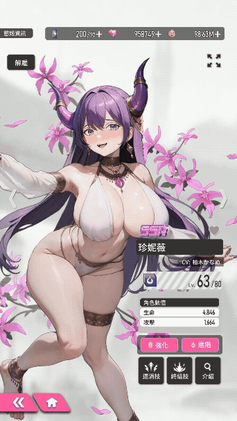 而招募到相同的慾姬,能用来强化慾姬的主动技「终结技」等级,或透过「解雇」来取得进阶素材。