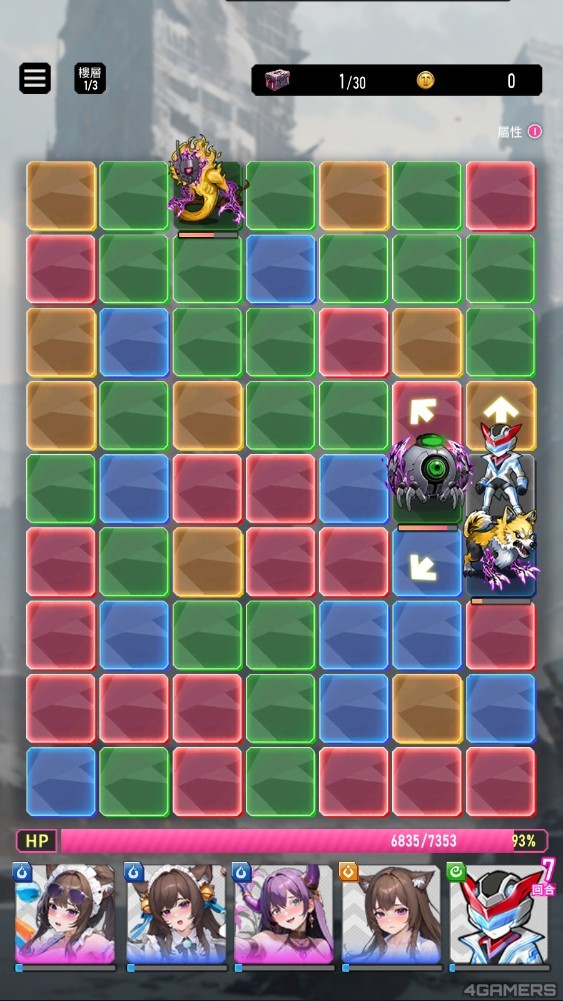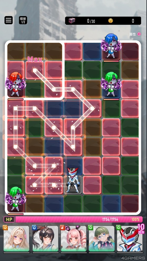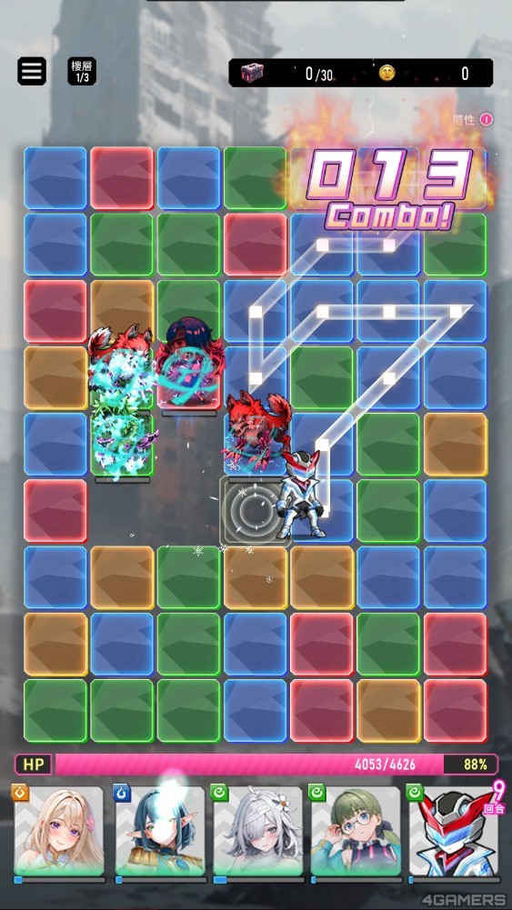主角开局时都会在画面下方,用手划向相同颜色的地格,放开后就能消除连线并产生 COMBO,让属性慾姬或主角(取决于武器属性)发动攻击。