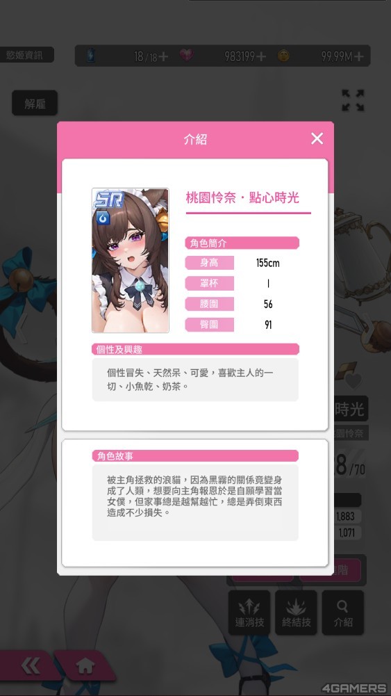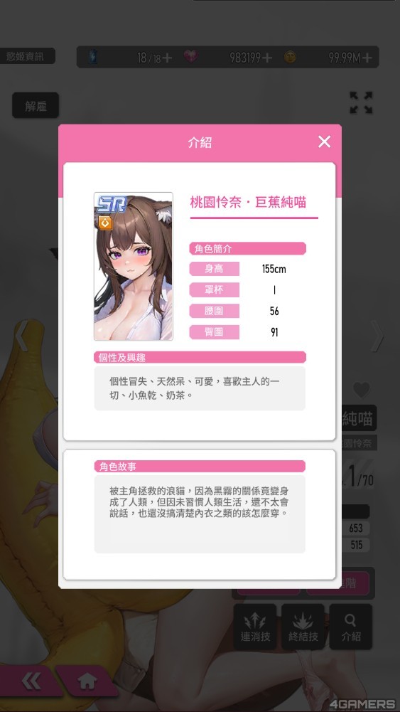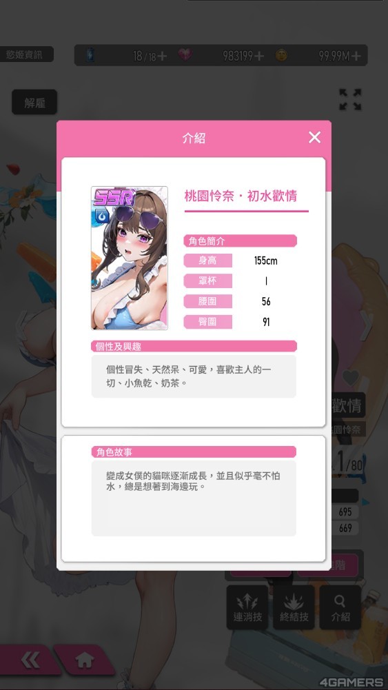 此外,编辑实测发现,首发版本的 SSR 角色当中,「桃园怜奈.初水欢情」是推图最强慾姬,本身角色数值就高得吓人,连消技「接球奉还」能清除所有小怪,再透过一发终结技,属性对了,甚至连 Boss 都可以秒掉。