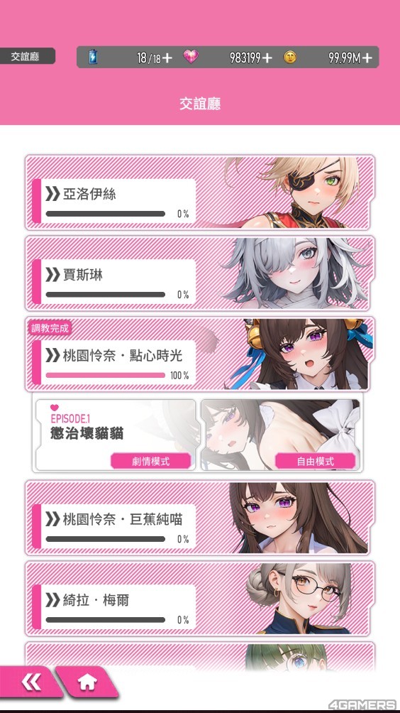 送礼时需消耗礼物跟体力值,每当好感度达 100%,角色就会显示「调教完成」,并解锁各自的瑟瑟结局与专属 CG 剧情。