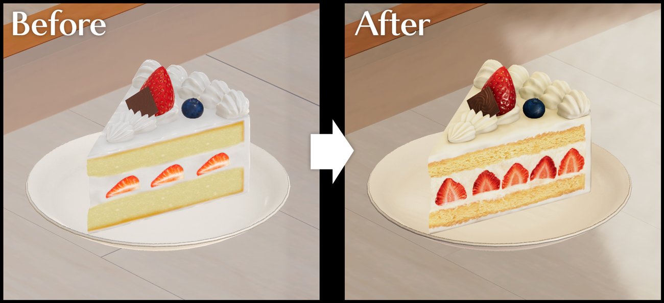 在此期间,团队也不断透过 X 更新建模的调整比对图,不只调整樱的建模,包括生活场景的即时光源演算、蛋糕等道具的材质更新等等,让整体空间更具真实感,画面表现更上一层楼。