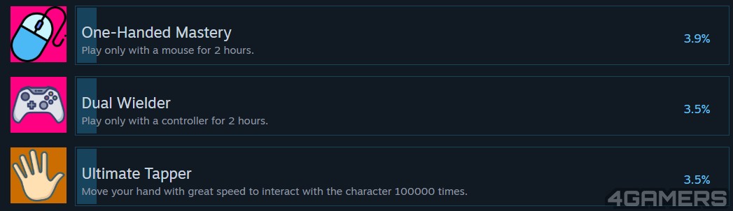 值得一提的是,本作还提供了 Steam 成就,不少成就解法需要累积拍打次数,或是游玩时间。像是「单手专精」(One-Handed Mastery)就是要用滑鼠玩上两小时。