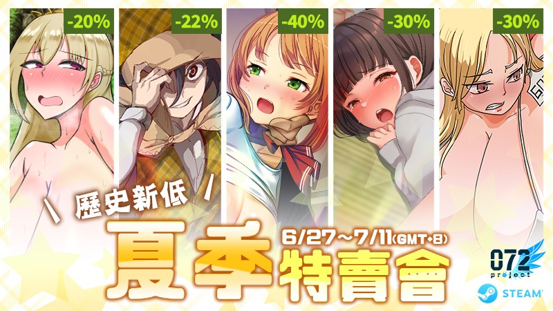 Steam 一年一度的夏季特卖会于 2025 年 6 月 27 日凌晨开跑!绅士发行商 072 Project 释出数款热门黄游的历史新低价,并提供懒人包给各位老司机快速挑选。