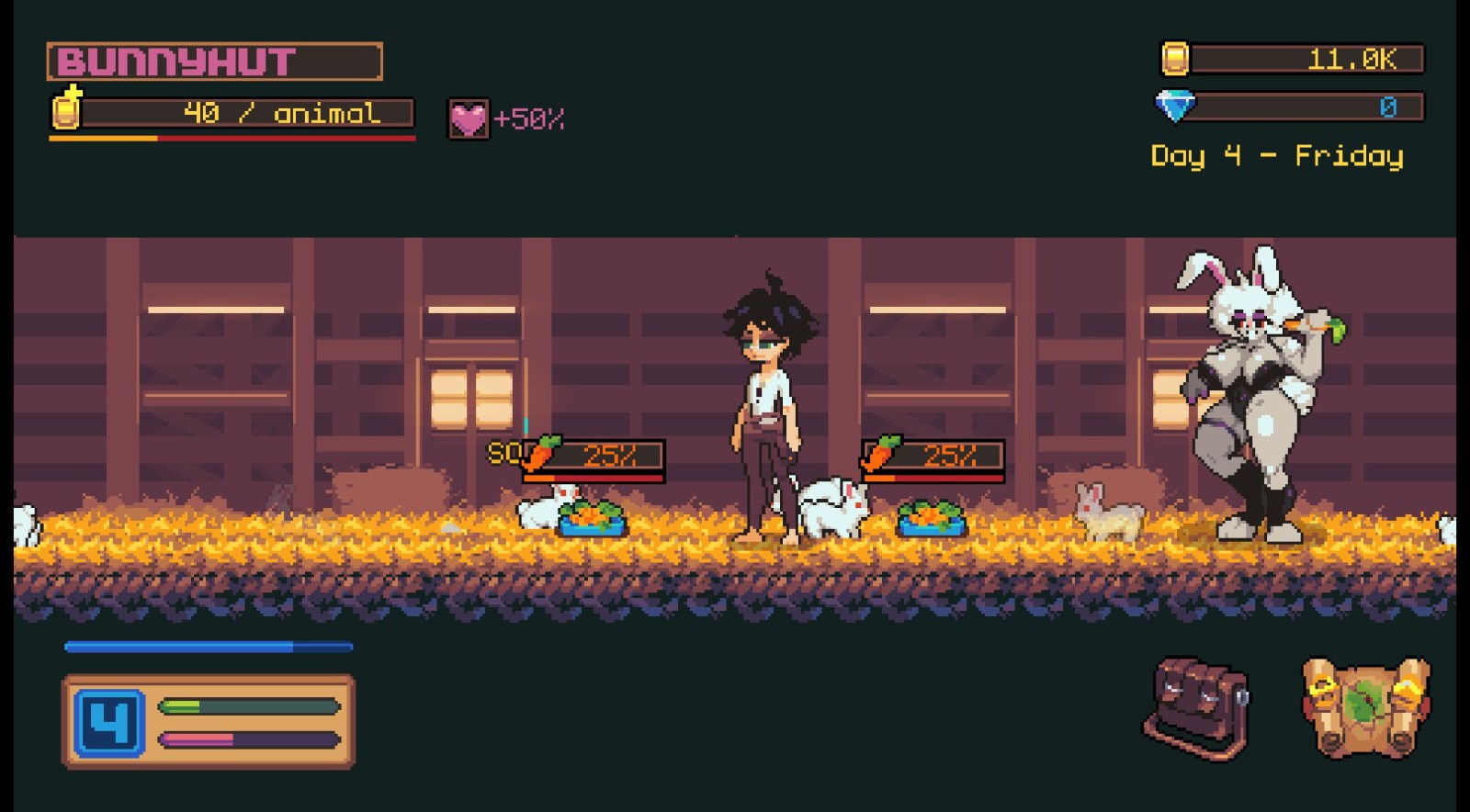 虽然故事都很类似,但玩法其实属于单纯的点击放置成长,玩家可拜访最初的兔子农舍,里头的魔物娘会协助兔子们交配繁殖让主角贩卖,而主角要做的就是用每天有限的体力去农场收成无限增生的红萝蔔。