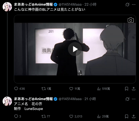 这部宣传影片在1 月2 日公开于 X 时就获得广大好评,近期因动画主题个人帐号转贴,顺利触及到海外甚至是非BL 粉丝的受众。许多海外网友对于「同人志竟然能做出这种水准的PV」感到惊讶,原影片的转载数和赞数再度暴增。