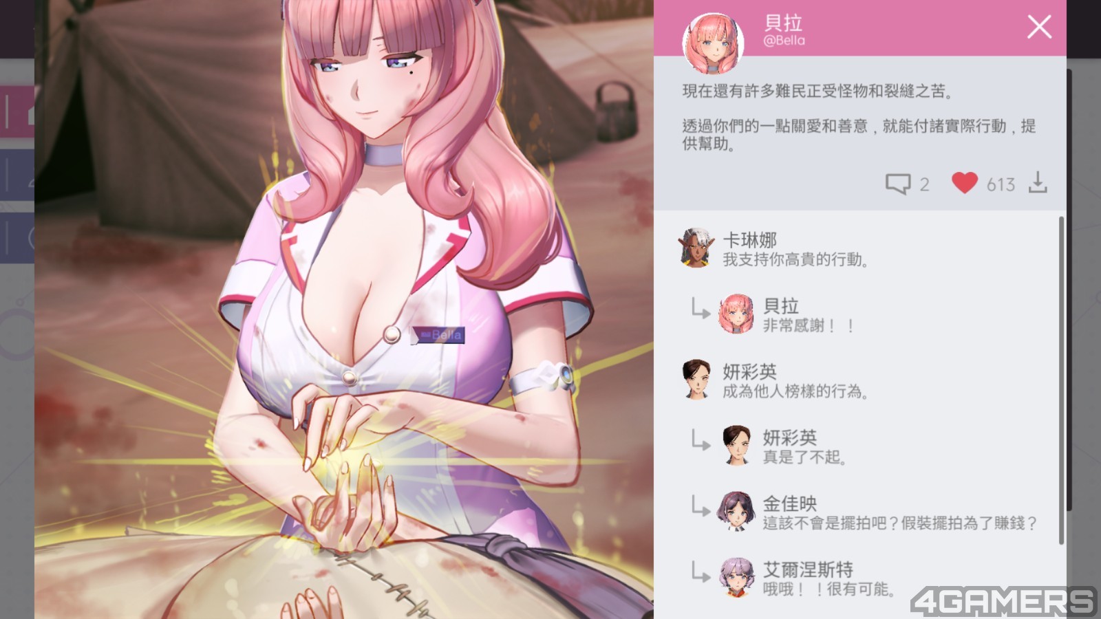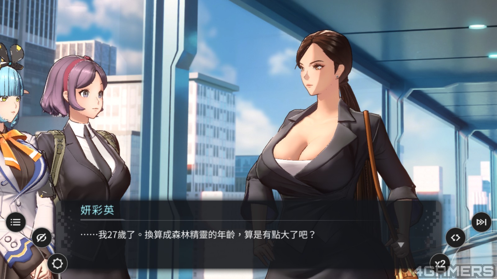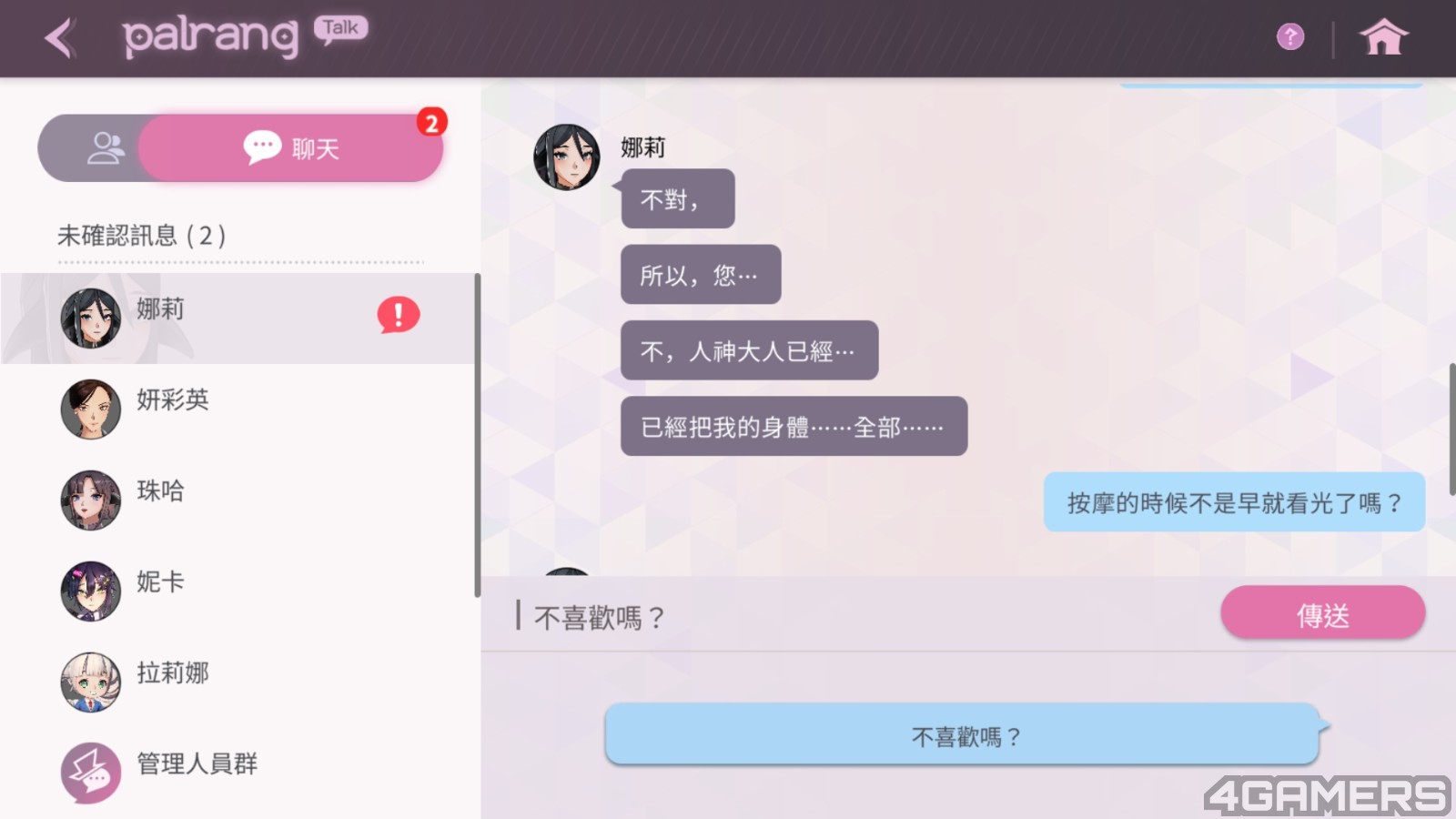 由于《地平线行者》世界观为近现代,因此各种设定都与现实较贴近,提升不少带入感。例如 UI 设计风格为「智慧型手机」,各种功能就像 APP 一样,还有跟每个女护卫加深交流的个人、群体聊天群组,甚至角色们还会把生活趣事上传到 SNS 上。你能看着女角们在 SNS 和聊天群组中发发废文、聊聊八卦,偶尔约她们到卧室做运动。