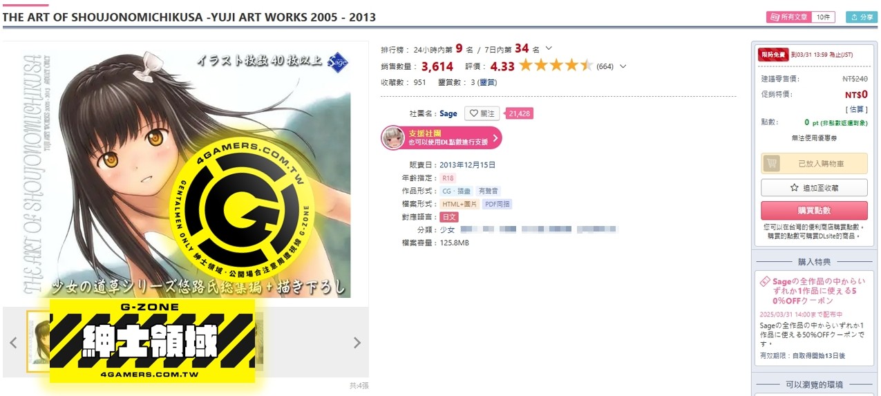 DLsite 在今年 3 月开放的限免游戏为 Sage 社团出品的《少女の道草》总集篇插画集,不过,因应 DLsite 前不久对海外用户的新规定,使得部分作品可能无法显示或购买,本次限免作品即属此範围。