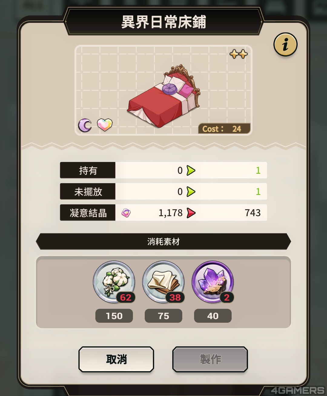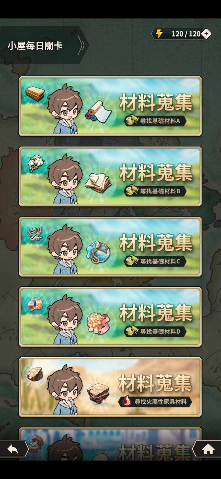 小屋每日关卡可以拿到的素材量其实不多,以「基础素材」的最高等关卡来看,一天内只能打到  30 几个,但桌子、柜子需要的其中一项素材可能要 100 个以上。建议看完当日的小屋每日任务需要做哪一种家具,直接从「製造」点进去需要进哪个素材关卡。