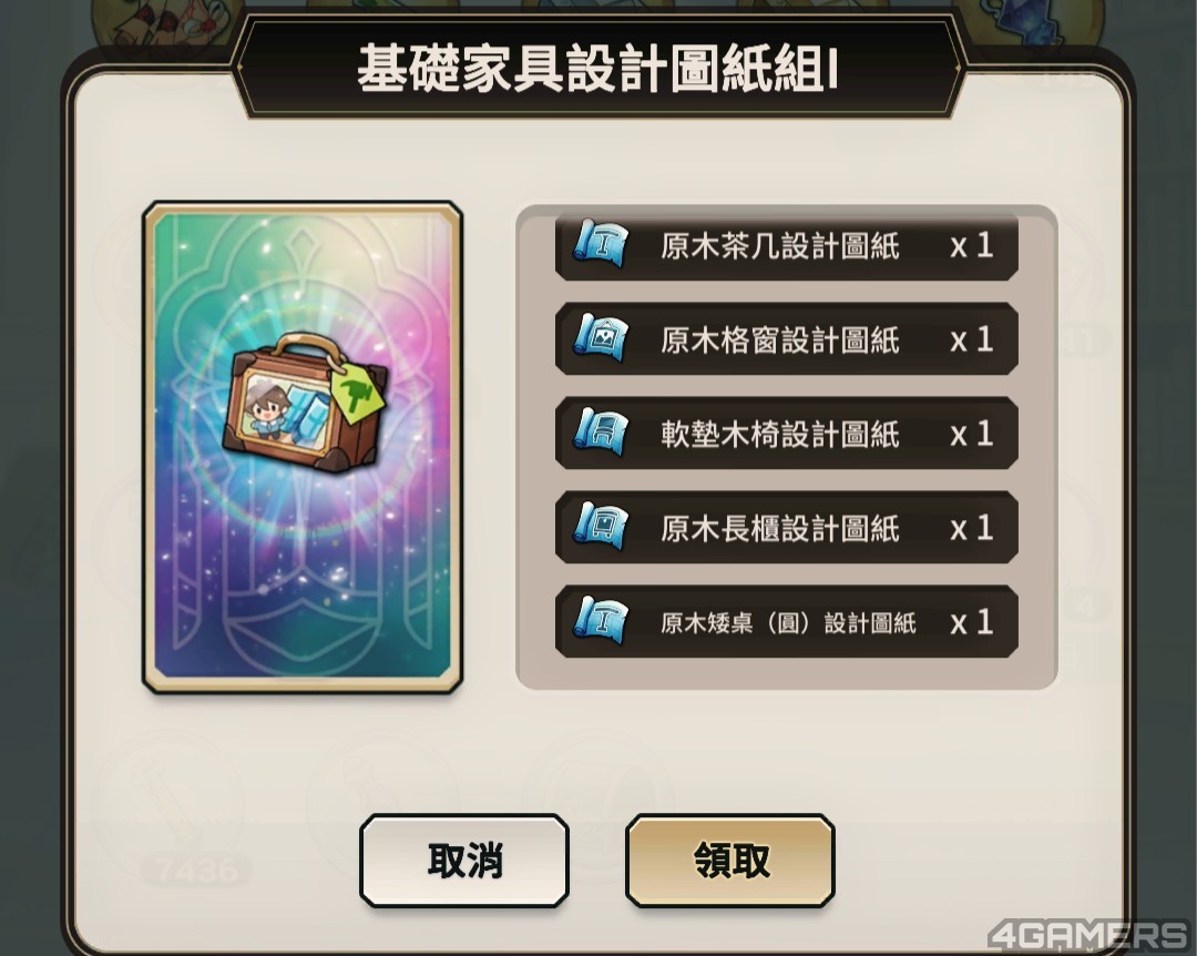 ➡️达到指定小屋等级,即可从小屋等级页面拿取奖励「设计图纸组」,需在游戏主页右上角的「仓库」点开「设计图纸组」才能解锁家具设计图
