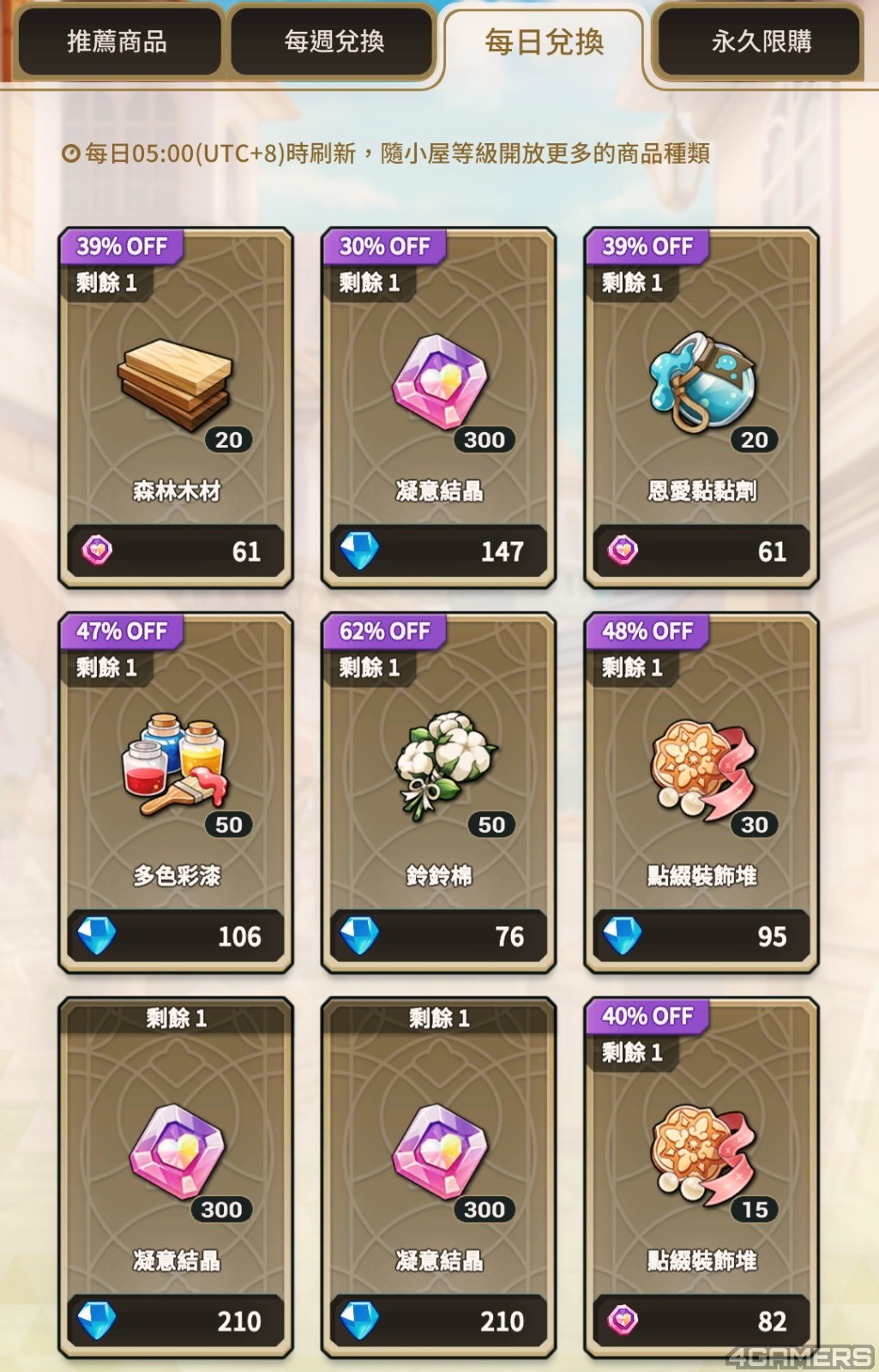 幸好,素材的取得方式除了每日关卡,还有「市集」。市集可以使用凝意结晶、晶灵石、魔蕴石兑换各种素材,另分成「每週兑换」和「每日兑换」。虽然也可以用晶灵石换素材,但考虑到最高等的素材关卡高机率能同时获得两种素材(各 30 几个),用晶灵石换并不太划算。