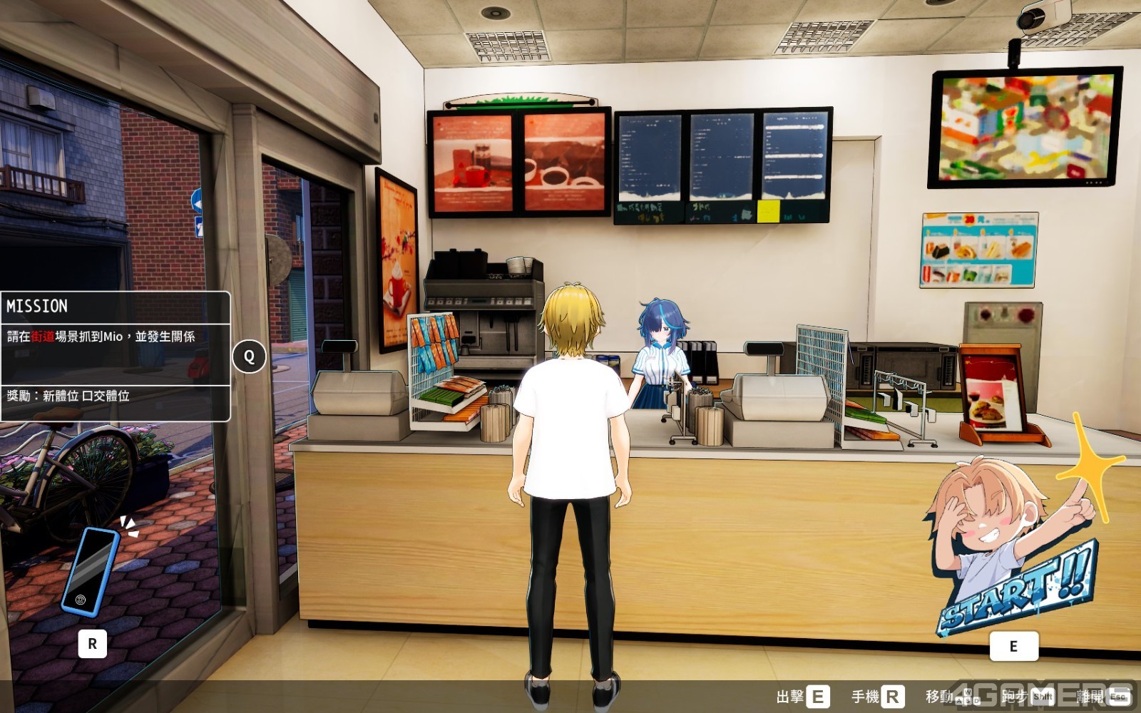 跟随着序幕剧情,玩家会首次来到澪打工的超商。你可以在便利商店内与澪聊天互动、购买跟踪/啪啪道具,游玩主茶叶蛋和打怪物两项小游戏赚钱。