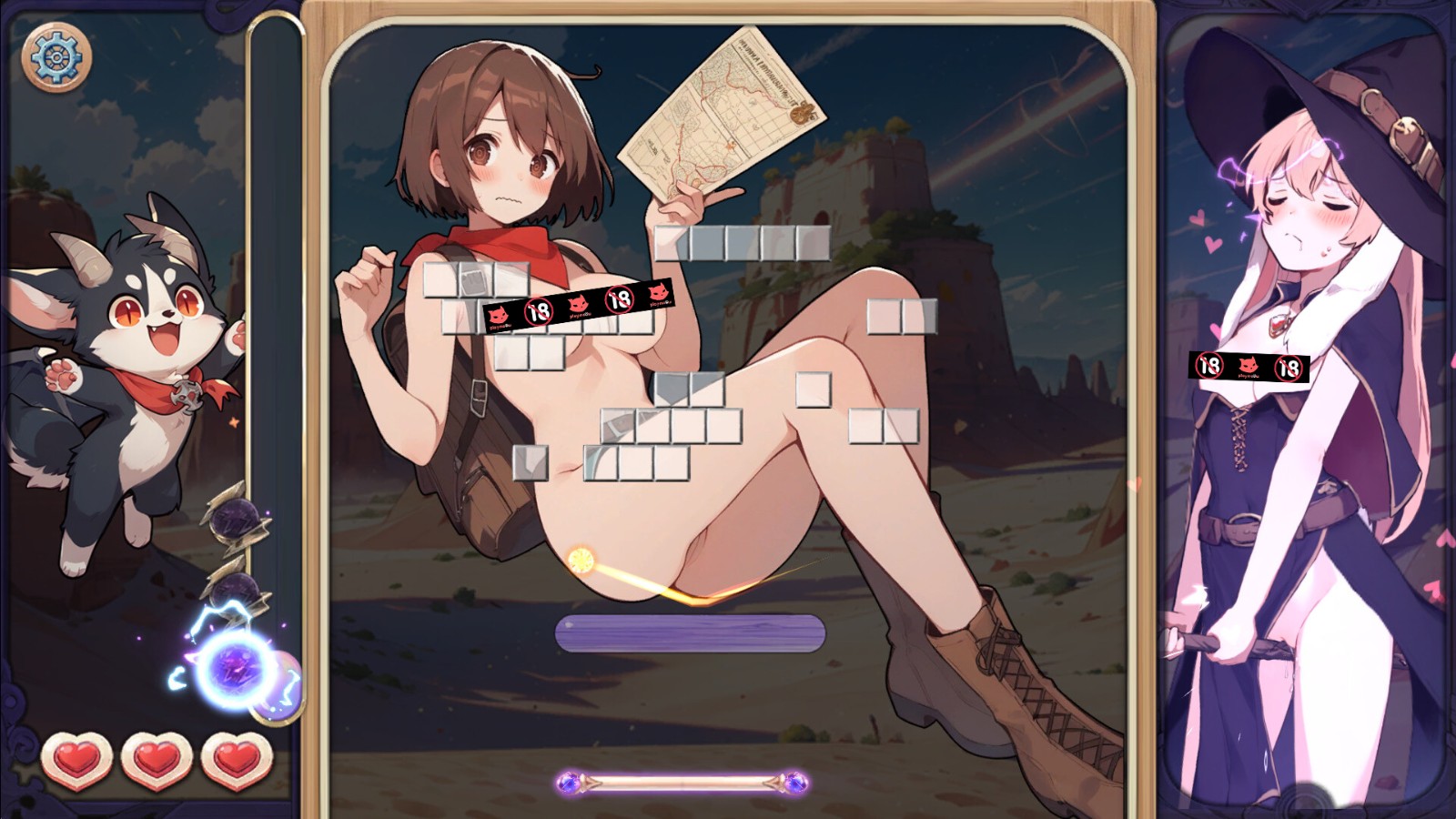本作玩法简单,左右移动滑鼠来控制画面底下的魔杖,随着能量球的轨迹以「打砖块」的方式消除马赛克,过程中还能使用魔法来协助,成功消除马赛克后即可帮助美少女冒险者们「逃离」马赛克的魔掌。
