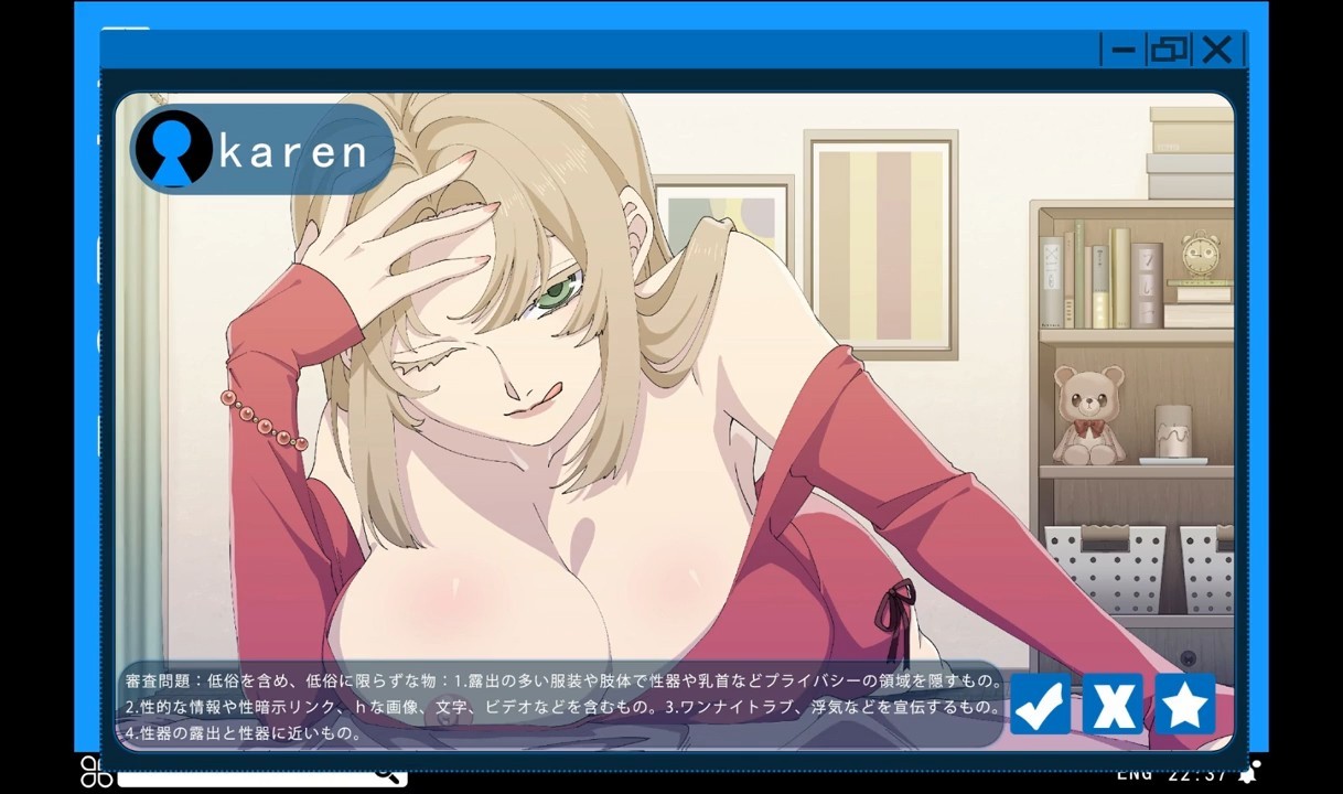 与前作《NTRaholic》类似,在游戏中玩家基本上还是有着时间管理的要素,上午、下午、晚上、深夜等 4 个不同时间点,透过行动力与点击选择审查工作来推进剧情。