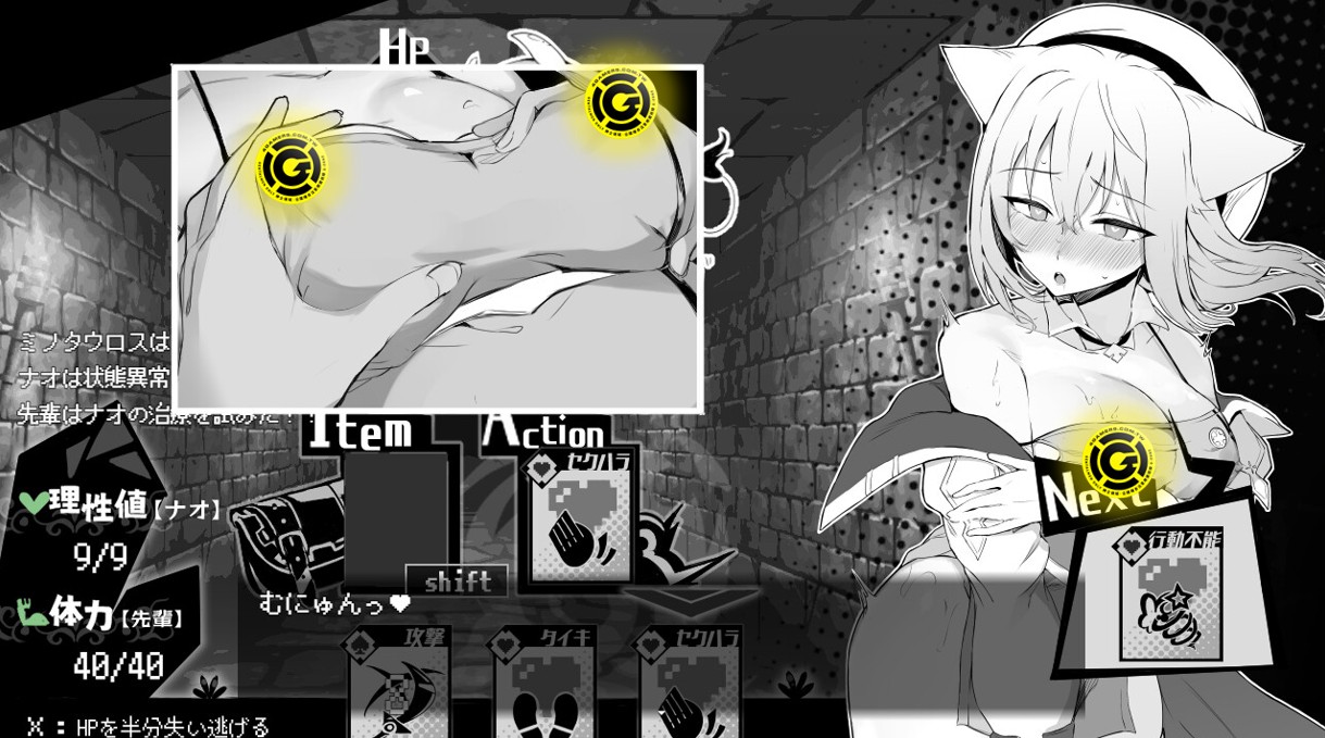 《娜欧发情中!》玩法虽然看似地城探索,但其实只是随机事件的堆叠与选择,大部份的过程着重在 Roguelike 卡牌的玩法上,透过攻击、变化与道具卡牌来应对战斗,而怪物则会施展状态异常攻击,玩家需要与娜欧互动,令其高潮解除 Debuff。