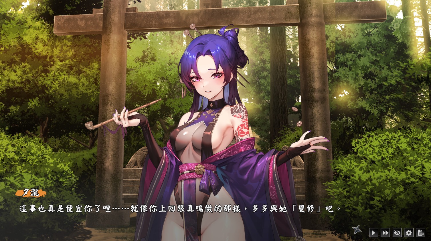 在游戏的过程,不论是主线剧情或关卡事件都有机会解锁 H 福利,而在挑战关卡期间,真鸣体内妖力过剩需要镇压时,也能进入双修模式来选择 H 互动事件,在场景内可选择衣物的穿脱或动作选择。