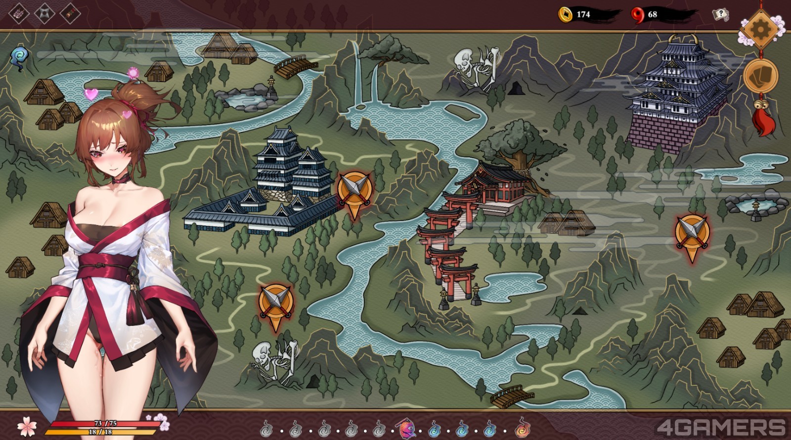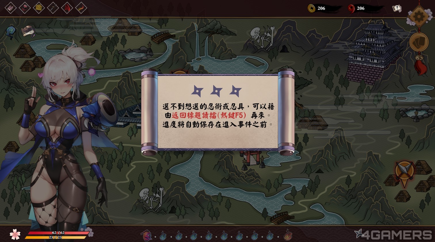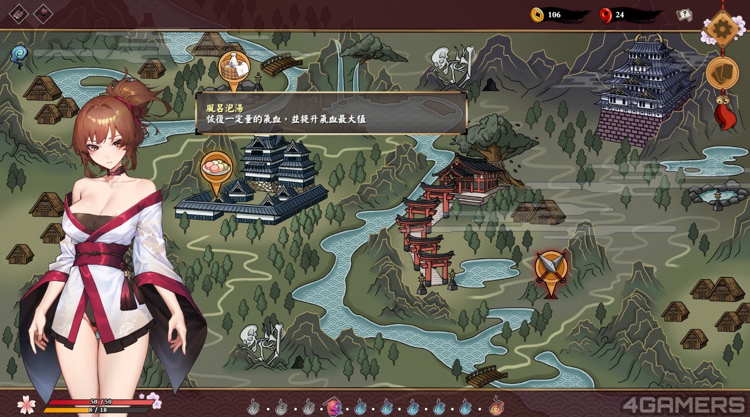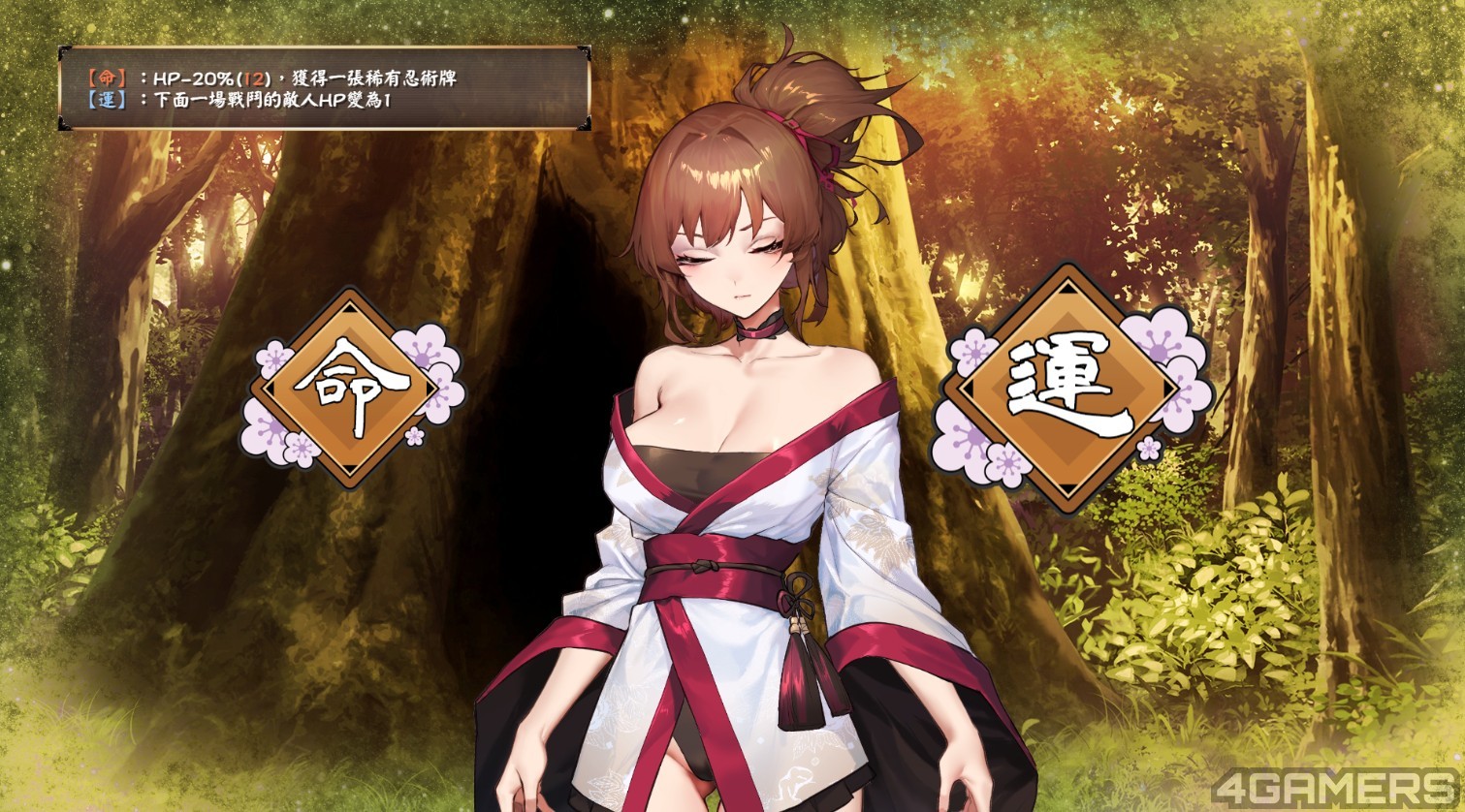 而《半妖忍少女》的故事共有四个章节,每个章节都是以 Roguelike 关卡形式在地图选择战斗或补给,部份补给会触发第一次的事件剧情,让玩家深入了解宫小路与真鸣两人的情感。