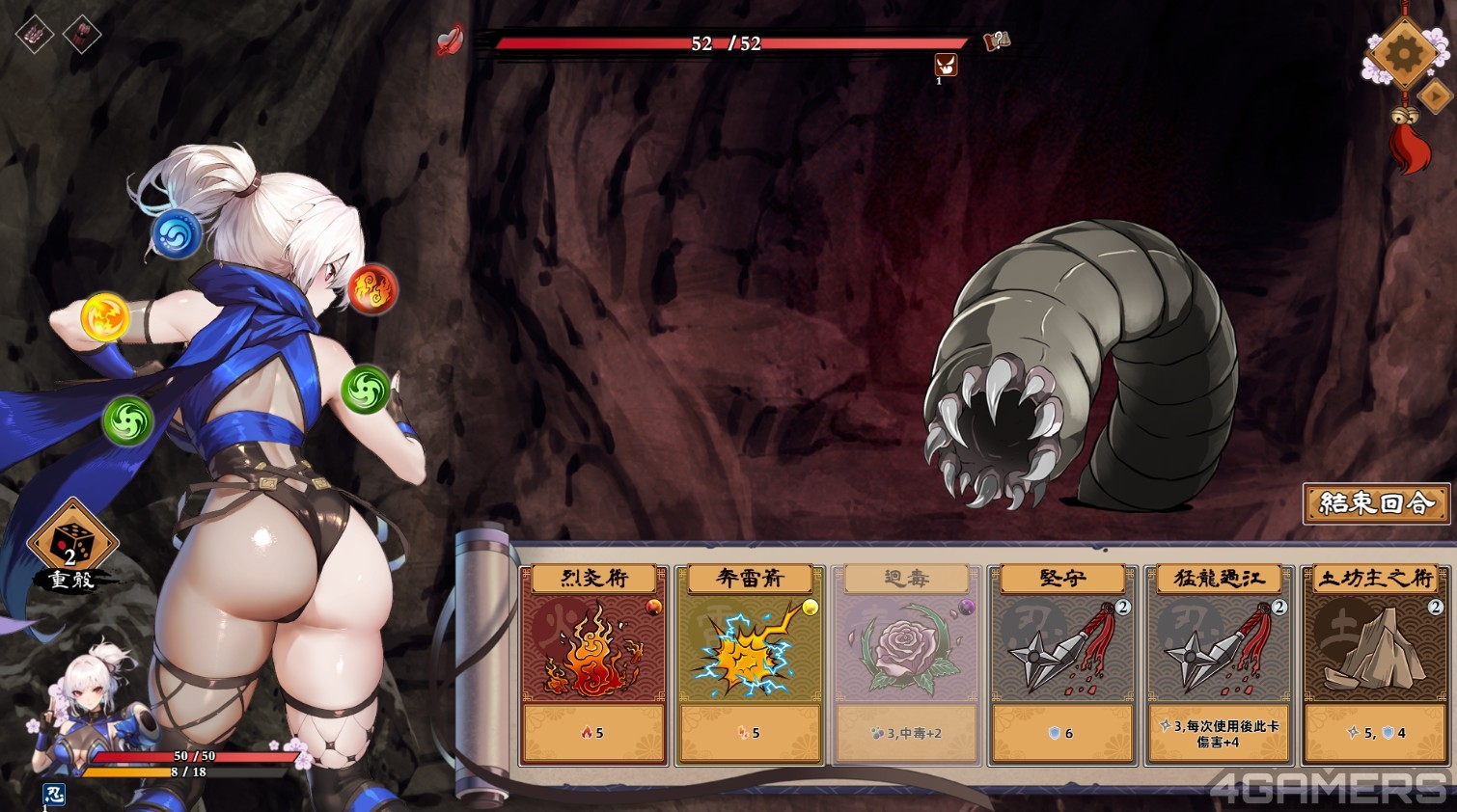 而这些剧情事件往往或获得「忍具」或「卡片」,这部份则是影响到卡牌战斗。与先前介绍一样,是採用「水火风雷土毒」六大属性的骰子与忍术(卡牌)相互搭配而成,每次能带上场的忍术仅 6 张,玩家能在战斗奖励获得不同的卡牌,组建出最佳的策略。
